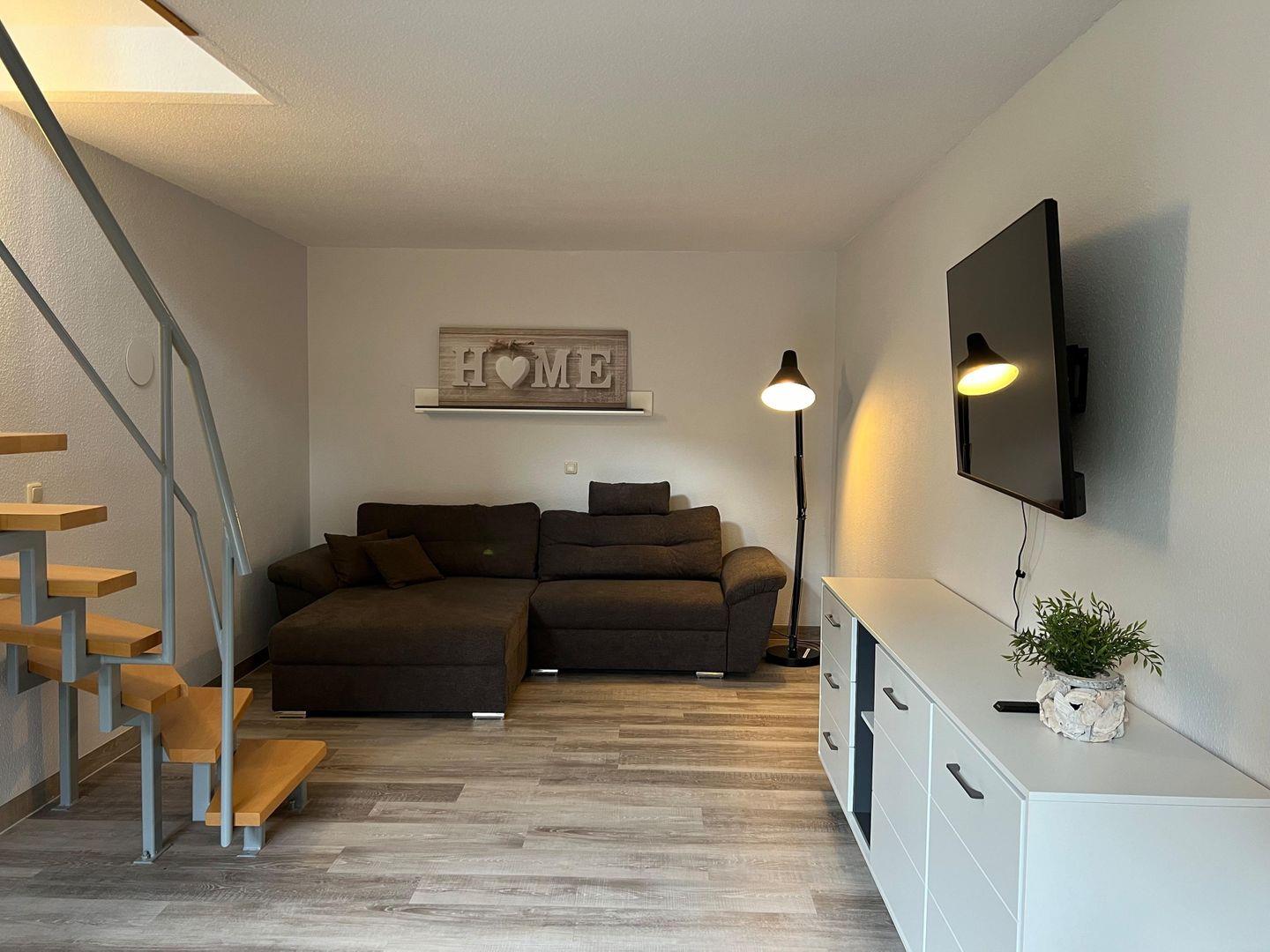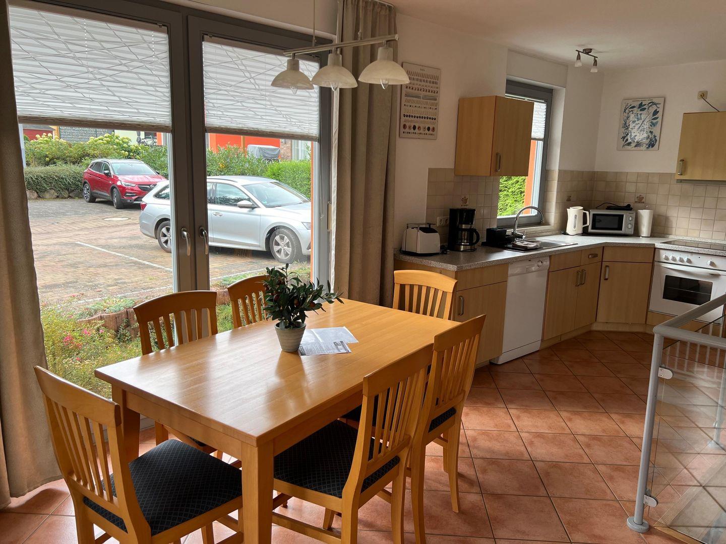 Diese Ferienwohnung mit ca. 100 m² erstreckt sich über 2 Etagen (Erdgeschoss und Souterrain). Im Erdgeschoss befindet sich der großzügige Eingangsbereich mit Garderobe und Familienbad inklusive Dusche, Wannenbad und WC sowie Haartrockner. Die vollausgestattete Küche (Geschirrspüler, Cerankochfeld, Backofen, Kühlschrank mit Gefrierfach, Mikrowelle, Toaster, Wasserkocher, Kaffeemaschine) hat einen gemütlichen Essplatz vor der wintergartenähnlichen Fensterfront , mit direkten Zugang zur großen Terrasse, auf der man von morgens bis abends in der Sonne sitzen kann.