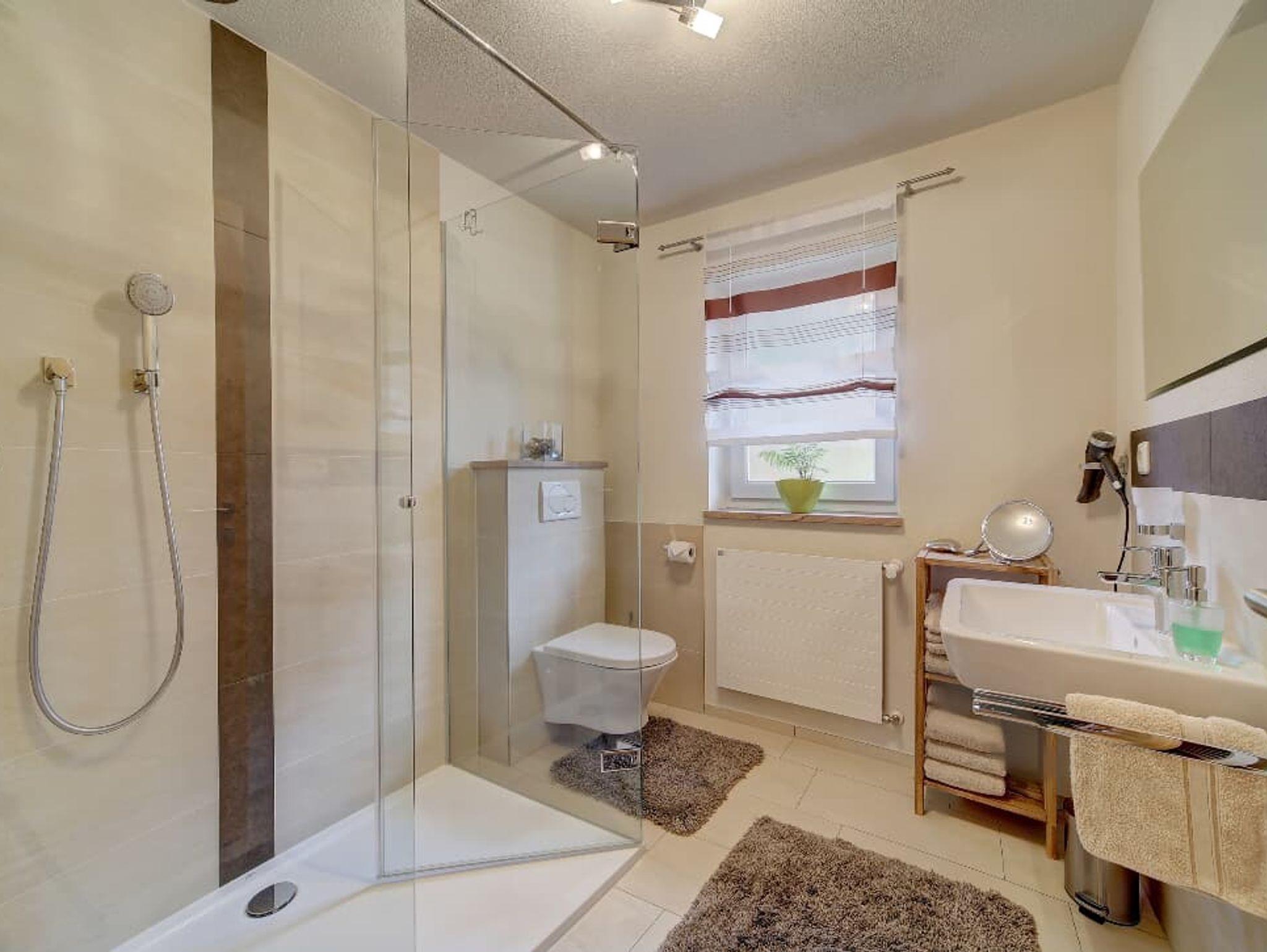 In dem Wohlfühlbad finden Sie eine Regenschauerdusche sowie einen Kosmetikspiegel