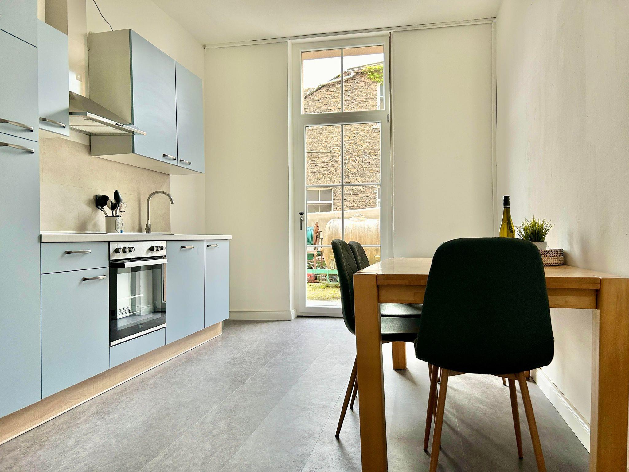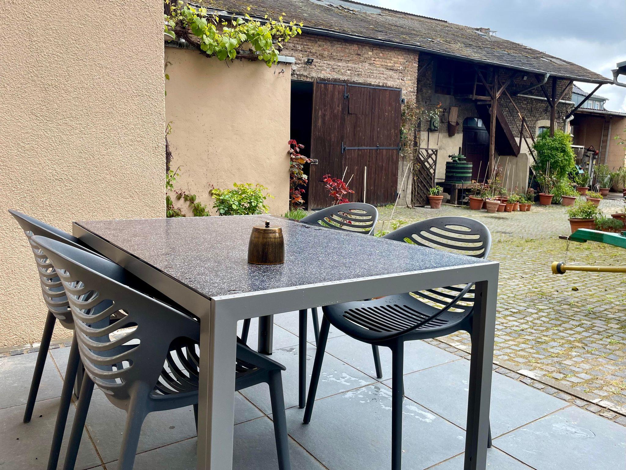 Die vollausgestattete Küche mit einem einladenden Esstisch bietet nicht nur einen perfekten Ort für gemeinsame Mahlzeiten, sondern auch direkten Zugang zur privaten Terrasse. Dort können Sie die Sonne genießen, ein Glas köstlichen Riesling verkosten und die malerische Umgebung des Weinguts bewundern.