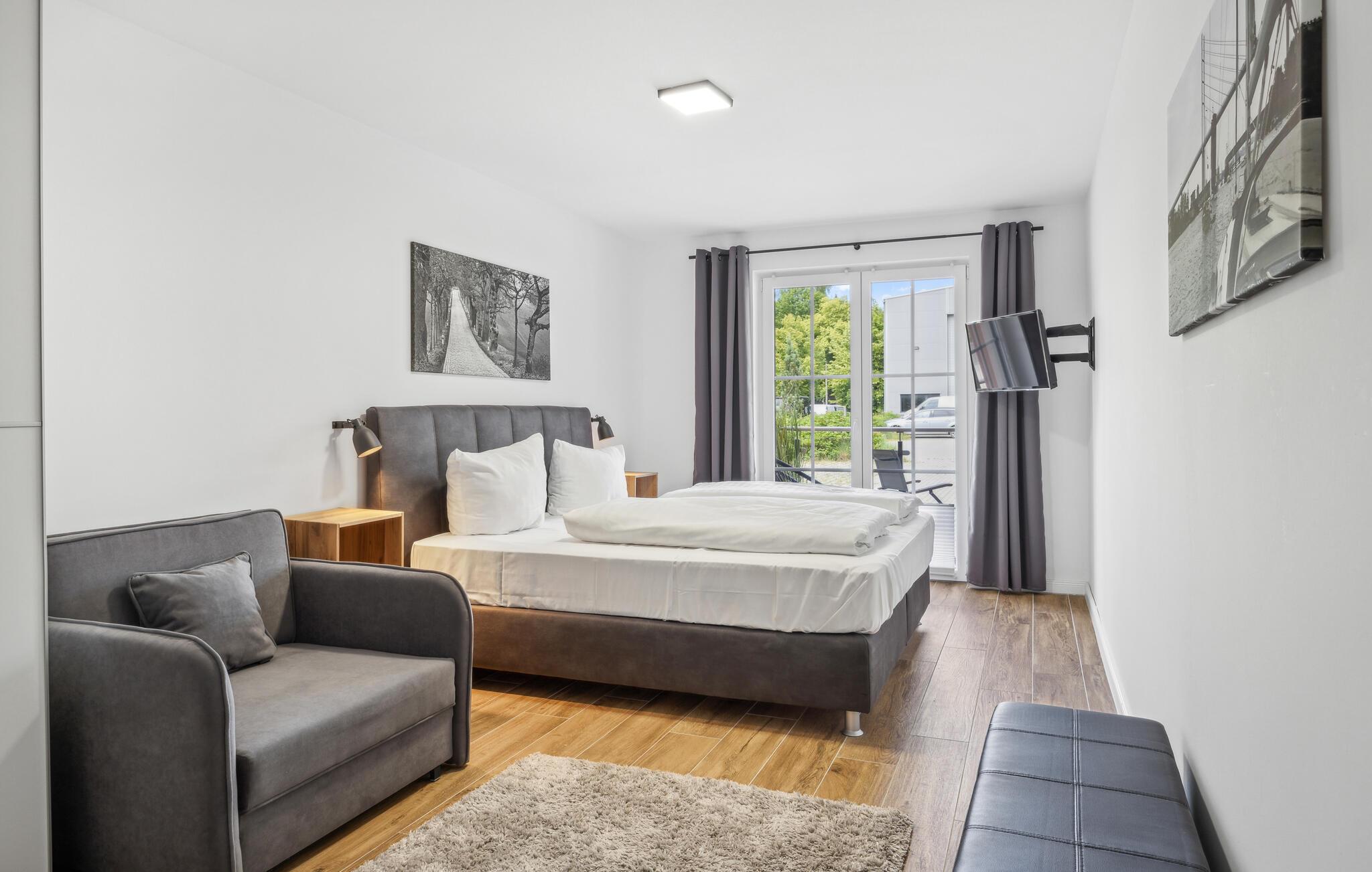 Tag på familie- eller parferie til Lauterbach, og opdag denne smukke lejlighed i stueetagen af et moderne lejlighedskompleks. Komfort, design og velvære er i fokus her, og I kan nyde det kvalitetsprægede miljø med pejs og det åbne rumkoncept i opholdsstuen. Glæd jer til fælles madlavning, spil eller wellnessaftener, for her har I en sauna til rådighed på badeværelset.
