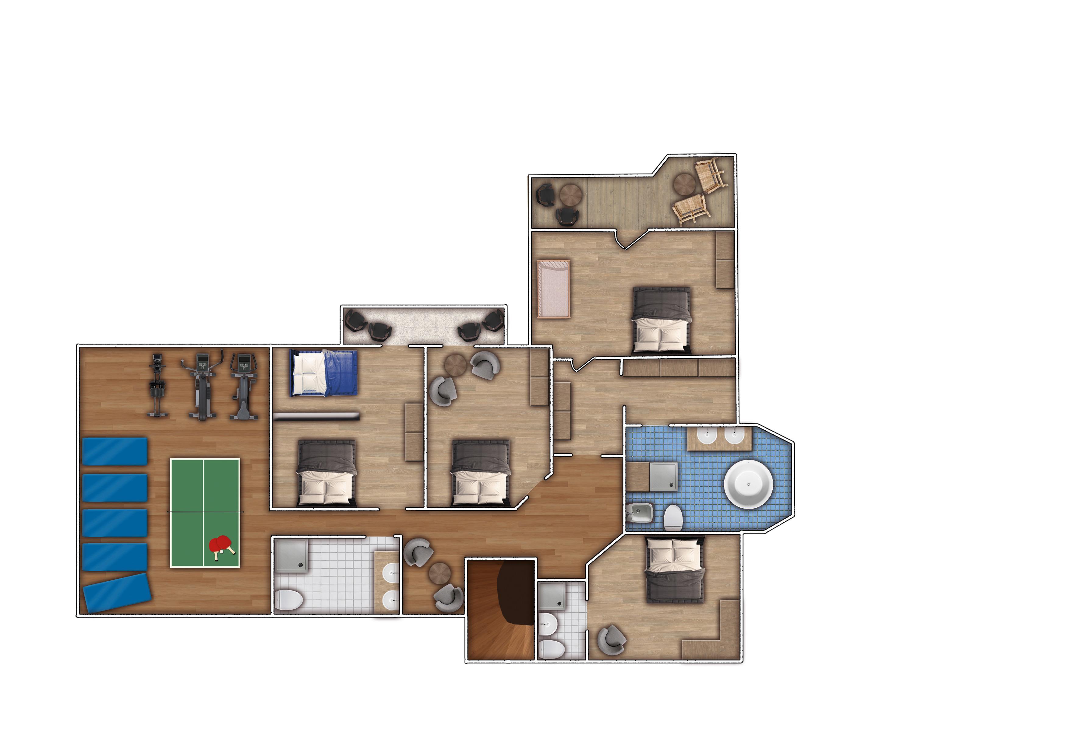 Unsere Villa verfügt über fünf stilvoll eingerichtete Schlafzimmer, darunter eins im Erdgeschoss und zwei mit einer großzügigen Loggia. Vier Bäder und ein Gäste-WC bieten höchsten Komfort. Auf der weitläufigen Terrasse mit Gartenmöbeln können Sie die frische Luft genießen.
