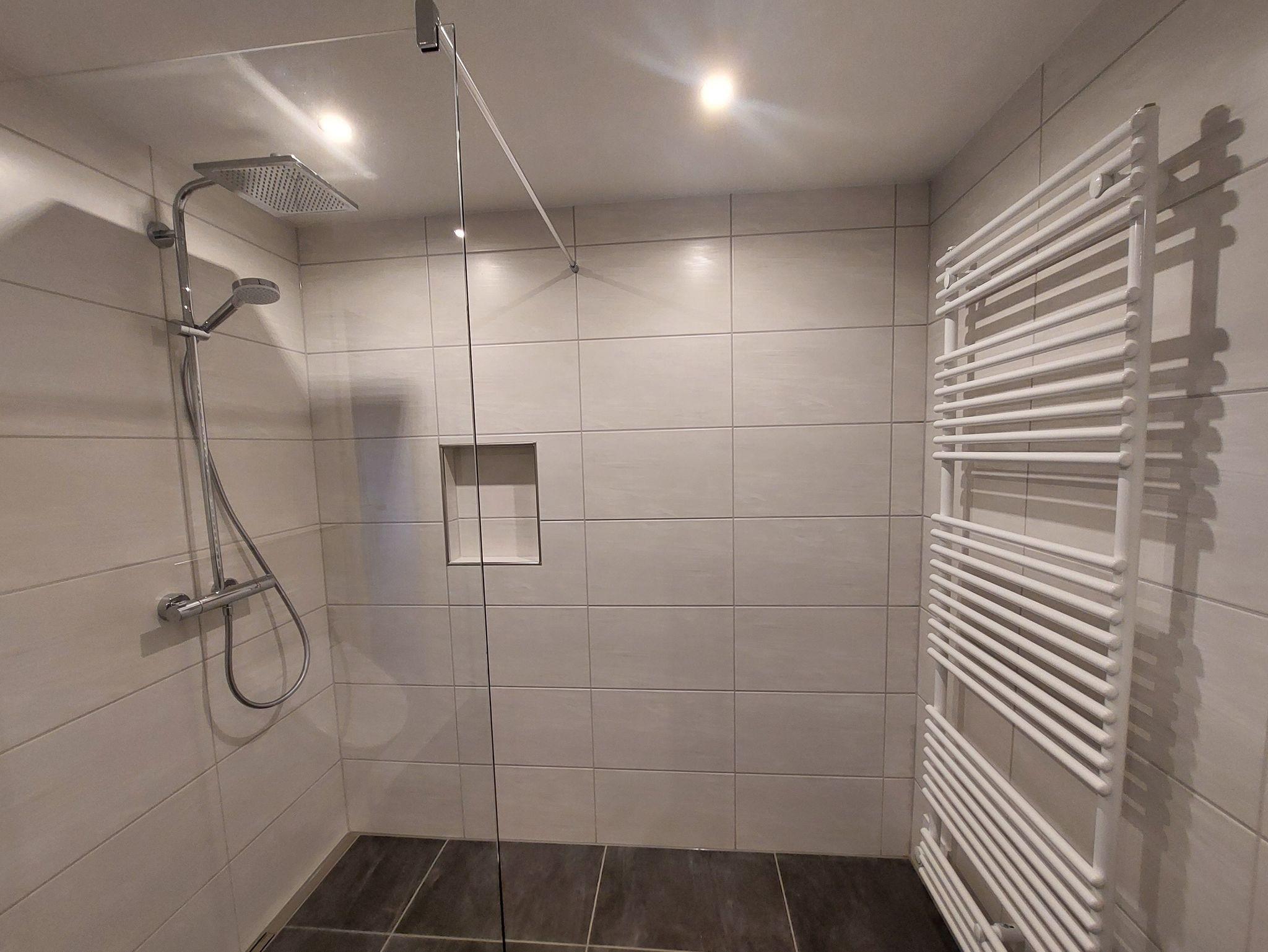 Das frisch sanierte Badezimmer lädt zum Wohlfühlen und Erfrischen für den Tag ein. Hier finden Sie ein Waschbecken mit beleuchtetem Spiegel inkl. Make-up Spiegel, WC, Urinal sowie eine schwellenfrei begehbare Dusche. Die Fußbodenerwärmung rundet das Bild des schönen Badezimmers ab.
