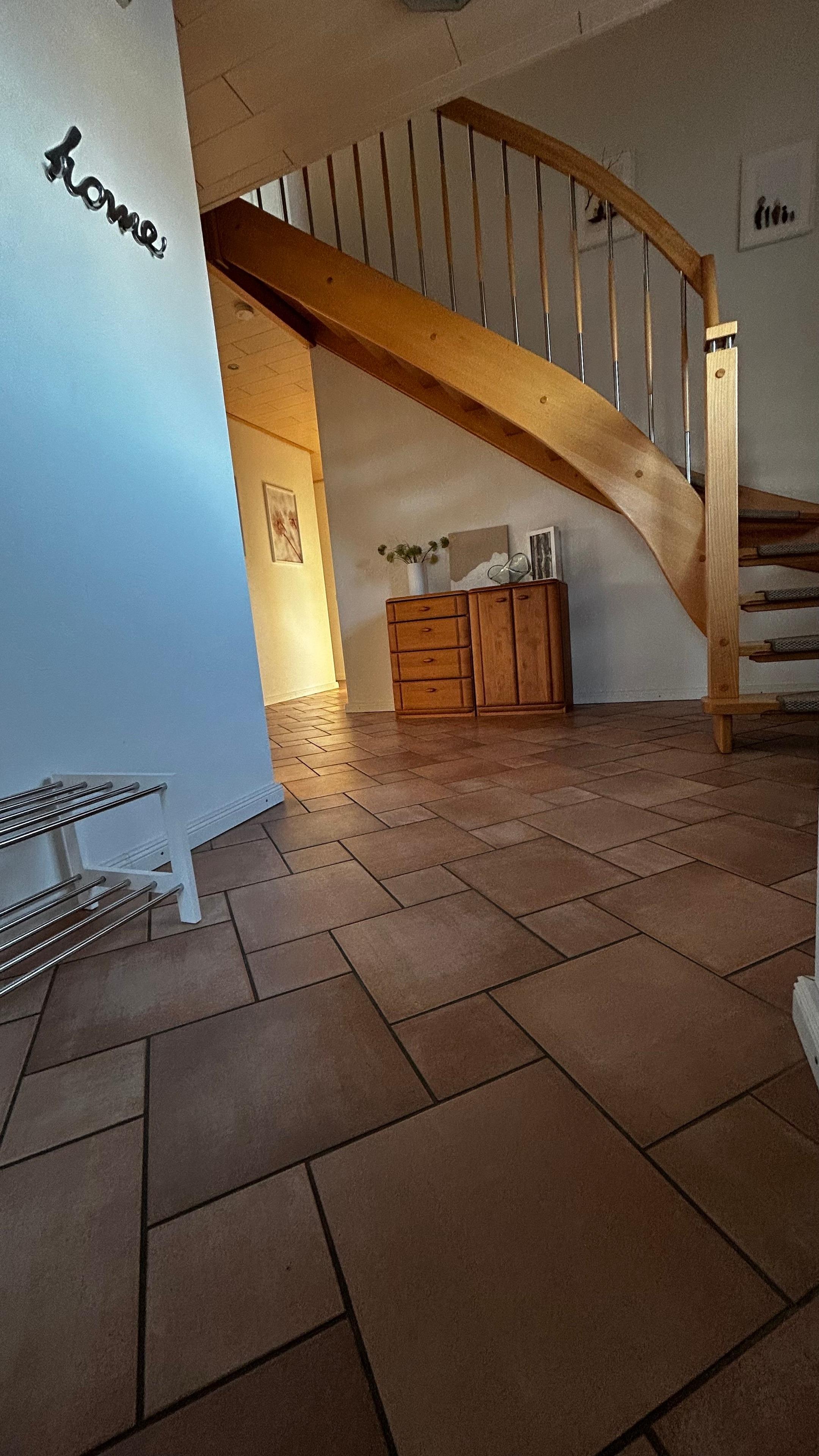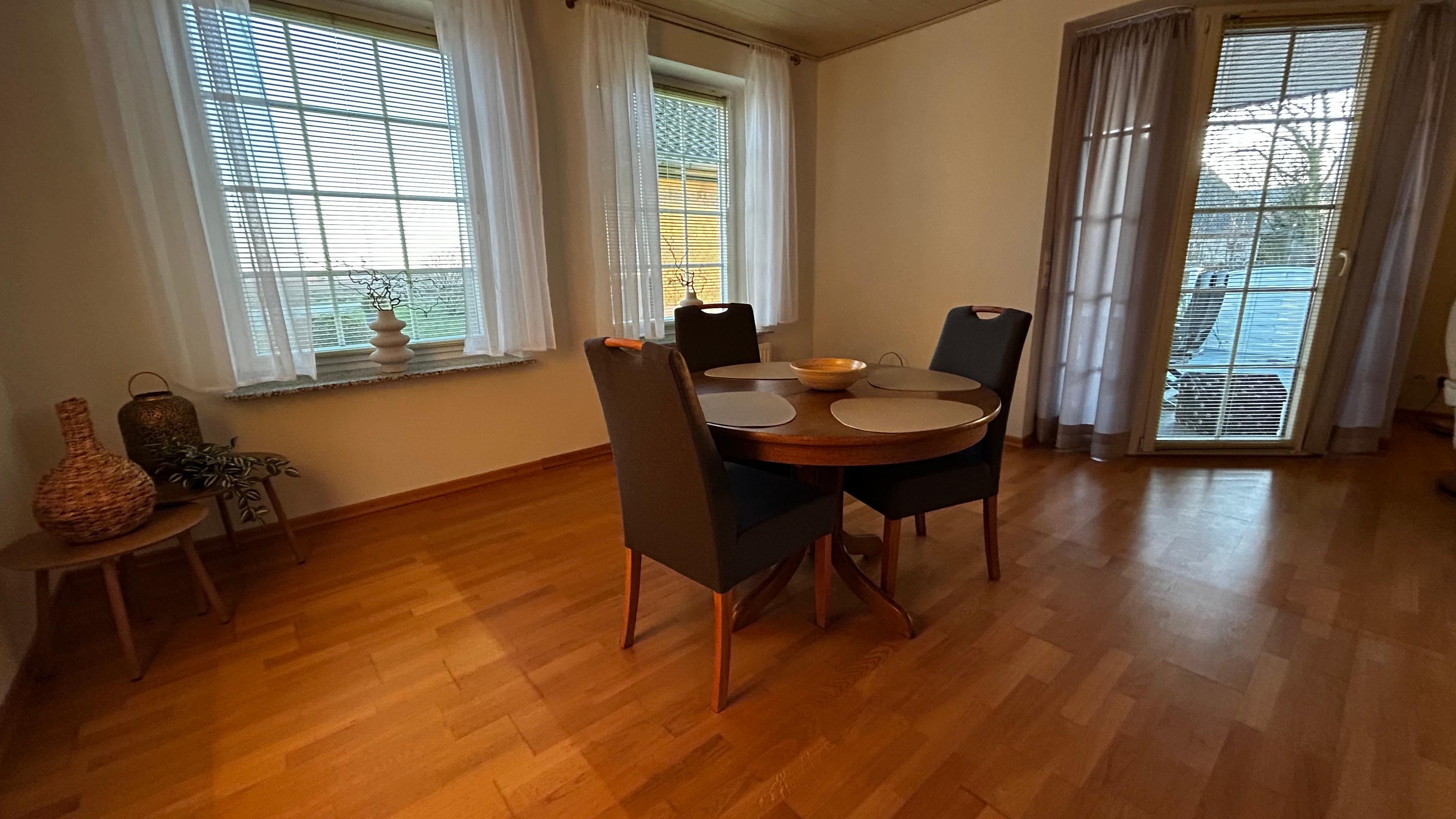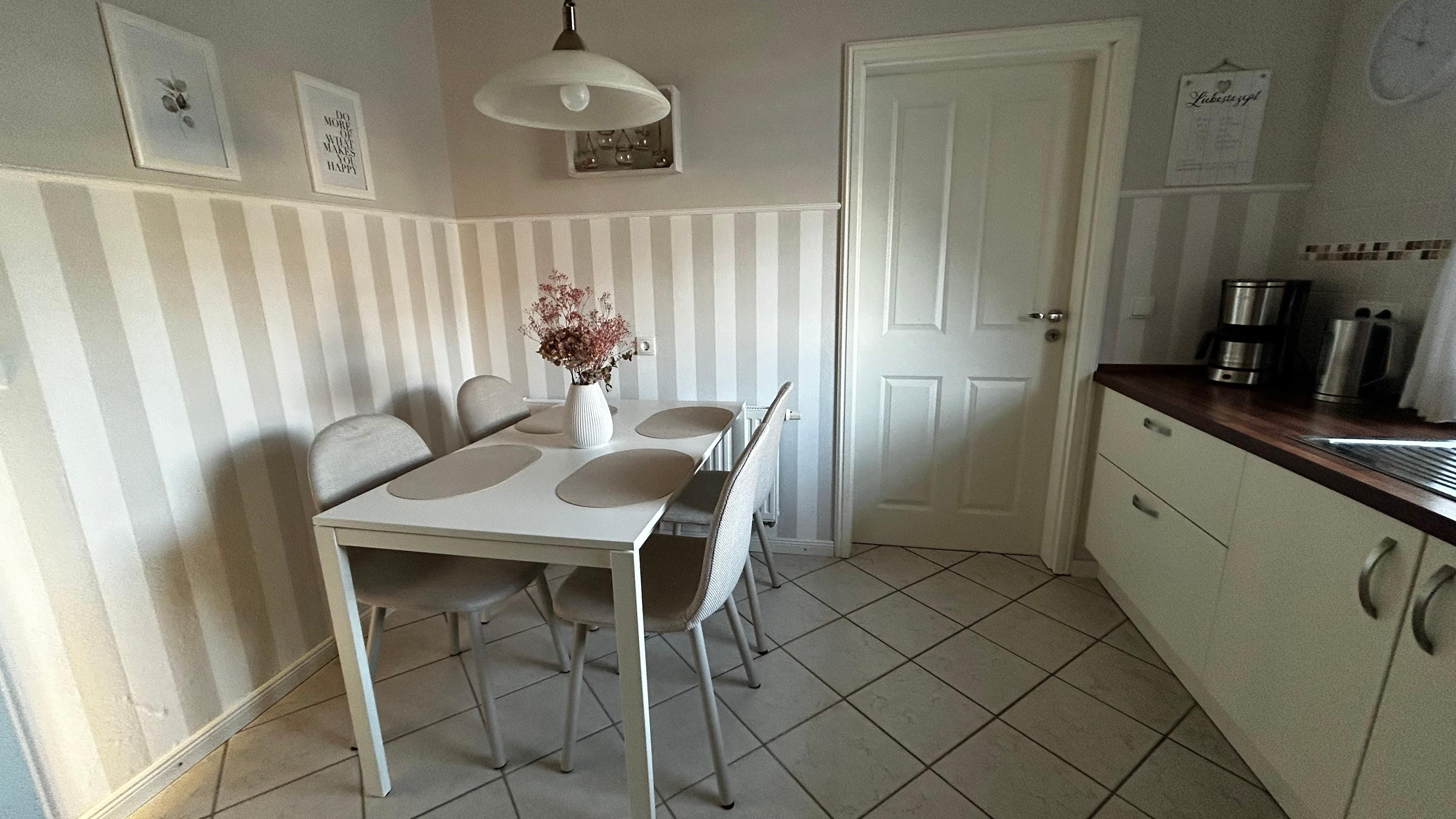 Im Erdgeschoss finden Sie ein Vollbad mit ebenerdiger Duschkabine, einer großzügigen Eckbadewanne, WC und Fußbodenheizung sowie ein zusätzliches Gäste-WC. Die separate Küche ist mit einer hochwertigen Einbauküche, einem Tisch und vier Stühlen ausgestattet. Hier stehen Ihnen eine Mikrowelle, ein Wasserkocher, eine Kaffeemaschine und eine Geschirrspülmaschine zur Verfügung. Ein Gefrierschrank und eine Waschmaschine befinden sich im Hauswirtschaftsraum, der von der Küche aus zugänglich ist und über einen separaten Hintereingang zum kostenfreien Parkplatz führt.