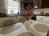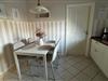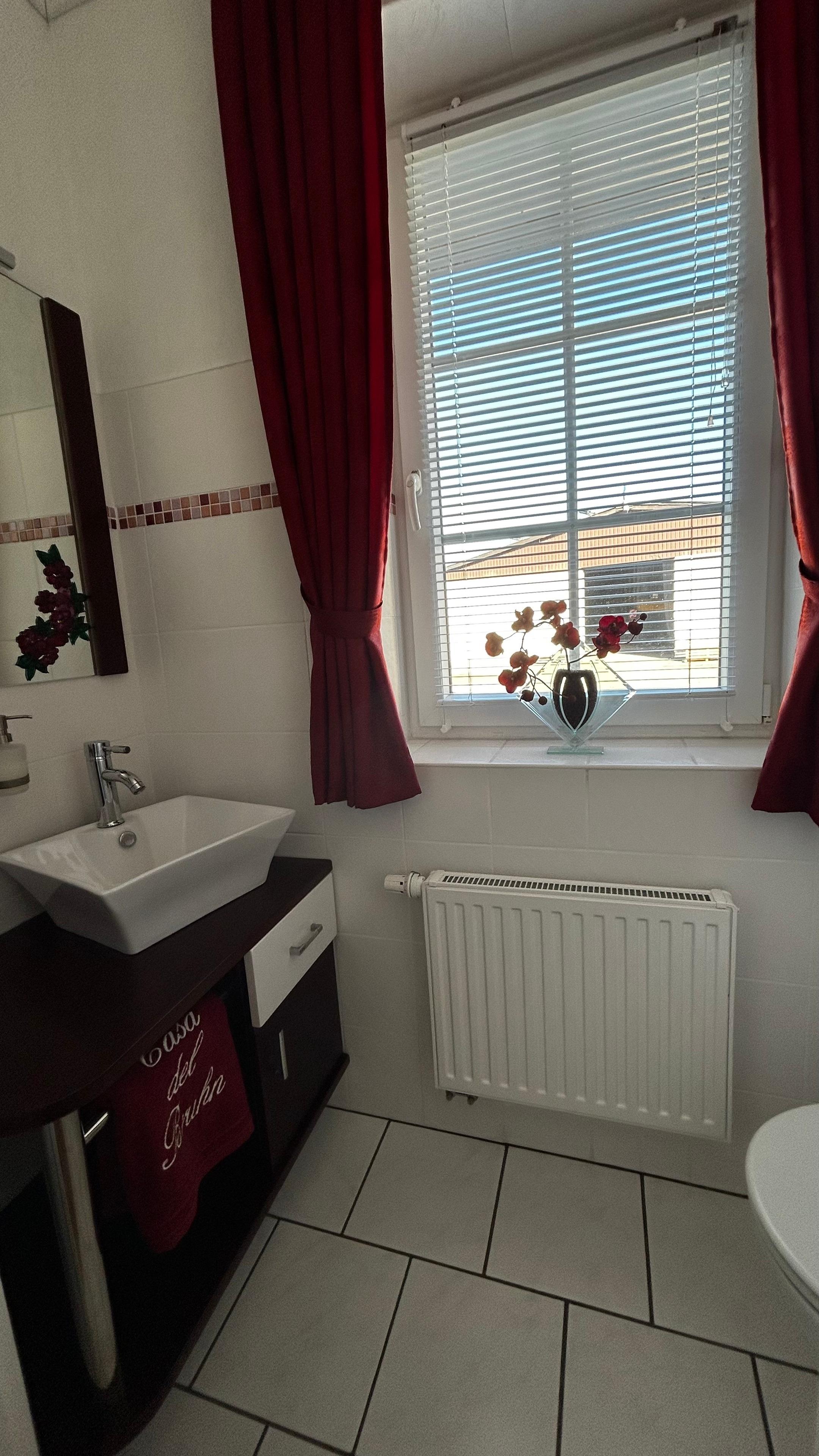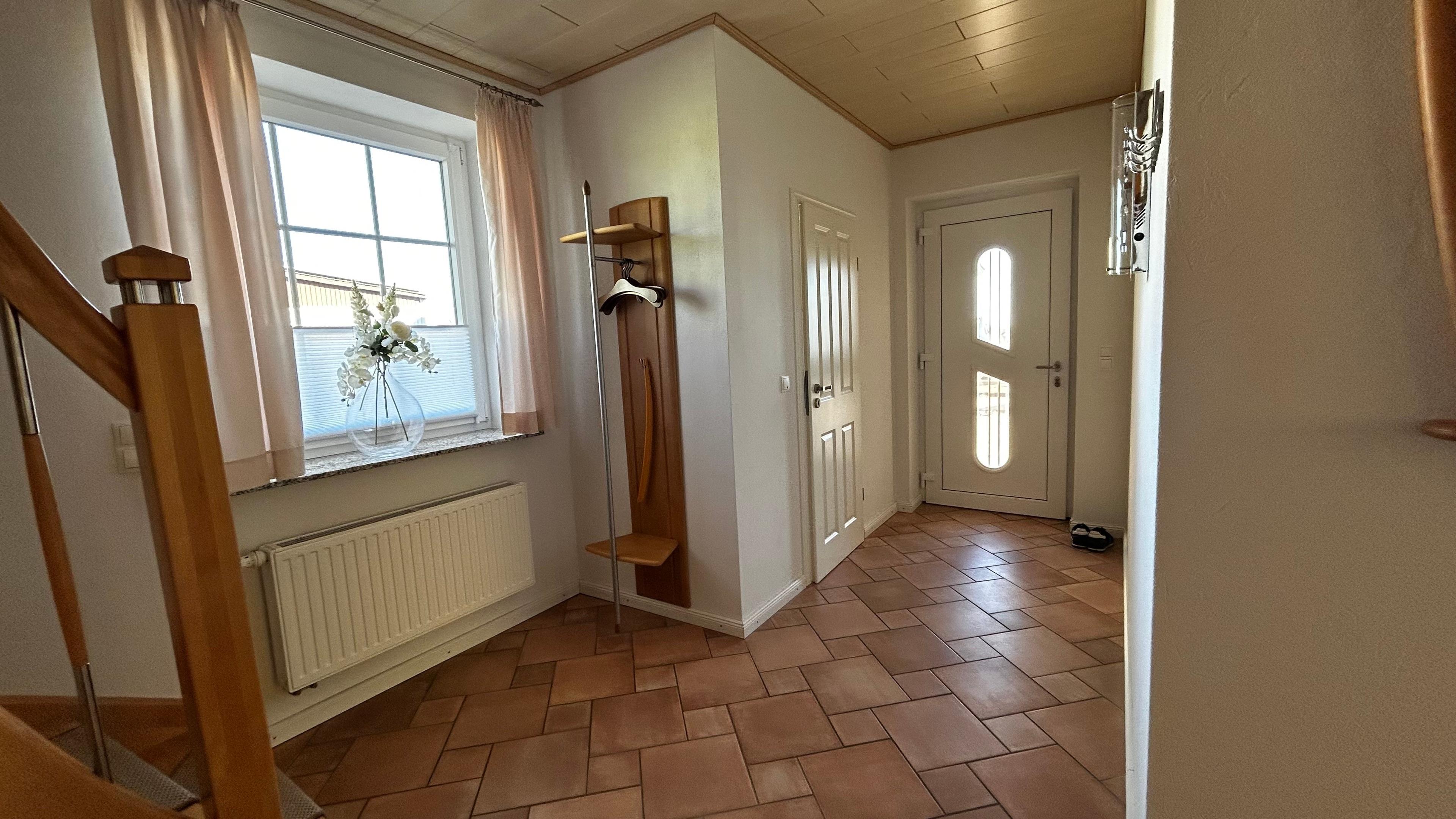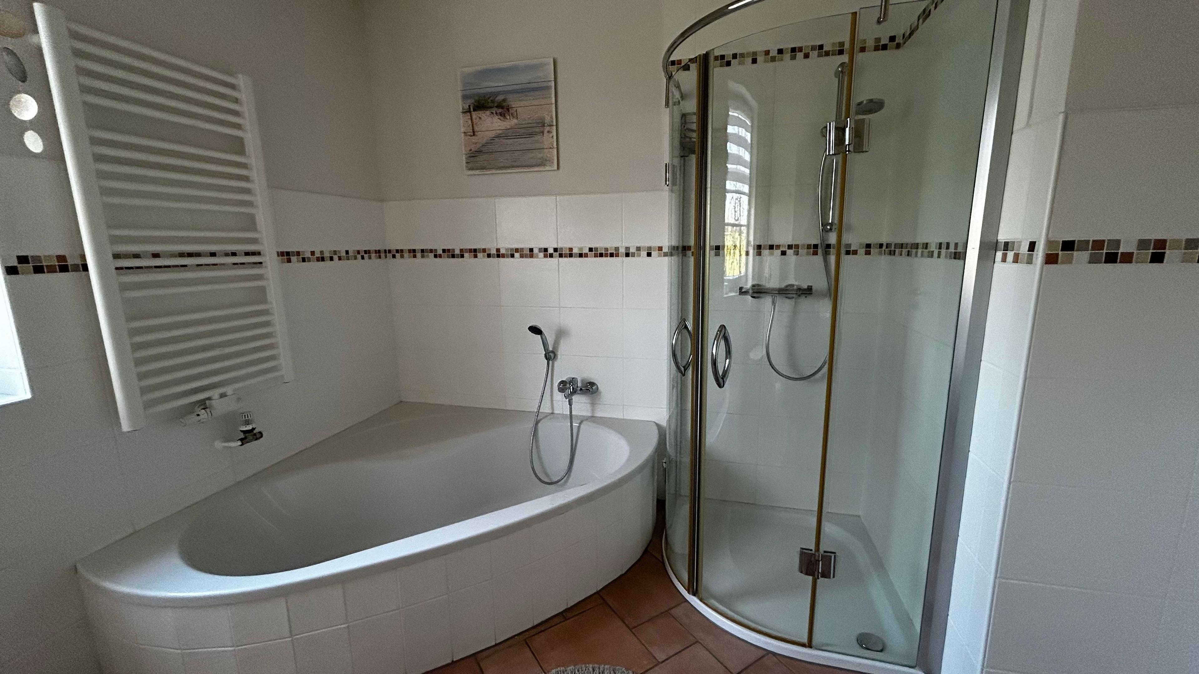 Im Erdgeschoss finden Sie ein Vollbad mit ebenerdiger Duschkabine, einer großzügigen Eckbadewanne, WC und Fußbodenheizung sowie ein zusätzliches Gäste-WC. Die separate Küche ist mit einer hochwertigen Einbauküche, einem Tisch und vier Stühlen ausgestattet. Hier stehen Ihnen eine Mikrowelle, ein Wasserkocher, eine Kaffeemaschine und eine Geschirrspülmaschine zur Verfügung. Ein Gefrierschrank und eine Waschmaschine befinden sich im Hauswirtschaftsraum, der von der Küche aus zugänglich ist und über einen separaten Hintereingang zum kostenfreien Parkplatz führt.