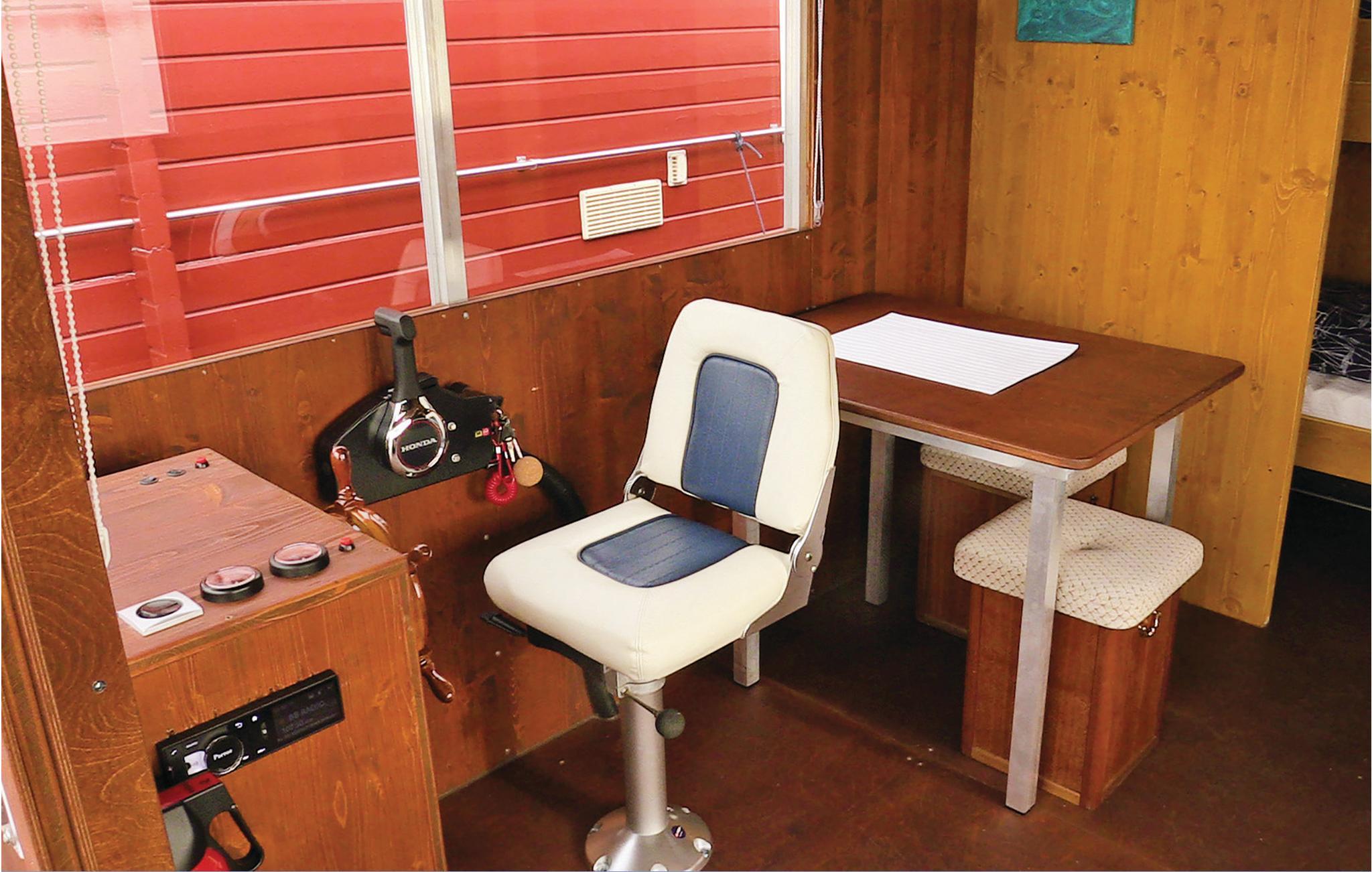 Der er adgang til husbåden via den åbne terrasse i boven og derfra indgang til stuen, hvorfra båden også styres. Her er en bekvem sovesofa, et tv med bose-højttalere og spiseafdeling. Stuen grænser op til en sovealkove med etagesenge og er herfra åben mod det lille te-køkken med elektrisk køleskab. Herfra indgang til det største soveværelse med etagesenge og et lille separat wc-rum med håndvask og elektrisk udsugning. Et brusebad med varmt vand ligger i bådens agter.