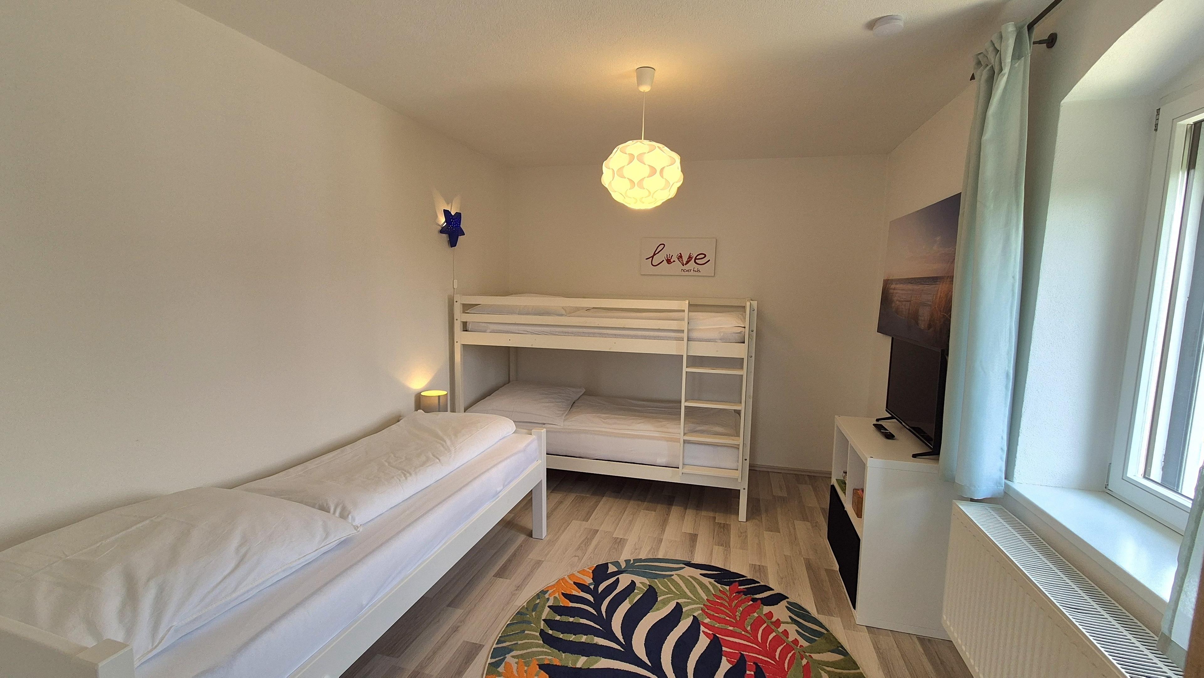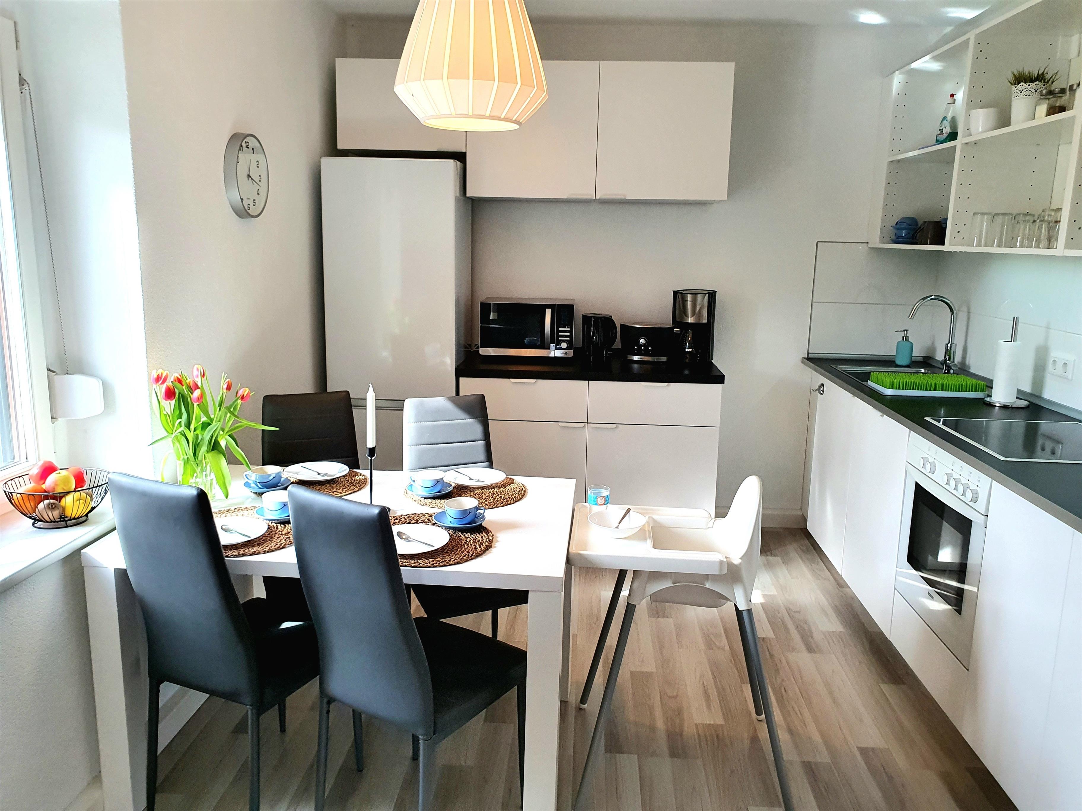 Die Wohnung verfügt über 4 Schlafzimmer, wovon drei Zimmer mit einem großen Doppelbett und einer Schlafcouch ausgestattet sind. Ein weiteres Schlafzimmer ist mit einem Etagenbett und einem Einzelbett ausgestattet. Zwei Babybetten mit Ausstattung stehen in der Unterkunft bereit. Neben einem 34 Quadratmeter großen Wohn- Esszimmer finden Sie eine gut ausgestattete Küche. Für die Kleinsten stehen zwei Kinderhochstühle sowie Kinderbesteck bereit.