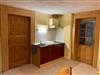 Die Ferienwohnung in Holzoptik verfügt über eine geräumige Wohnküche mit Eßecke, Wohnzimmer mit gemütliche Sitzecke, ein Schlafzimmer mit Doppelbett und großes Badezimmer mit Dusche, WC und Waschmaschine.