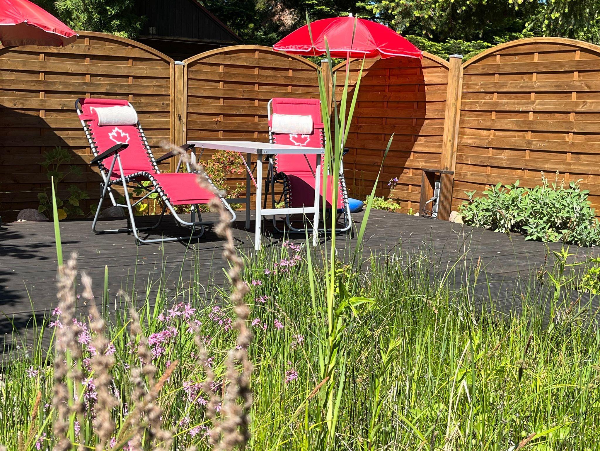 Ein großer Garten mit viele gemütliche Sitzecken.