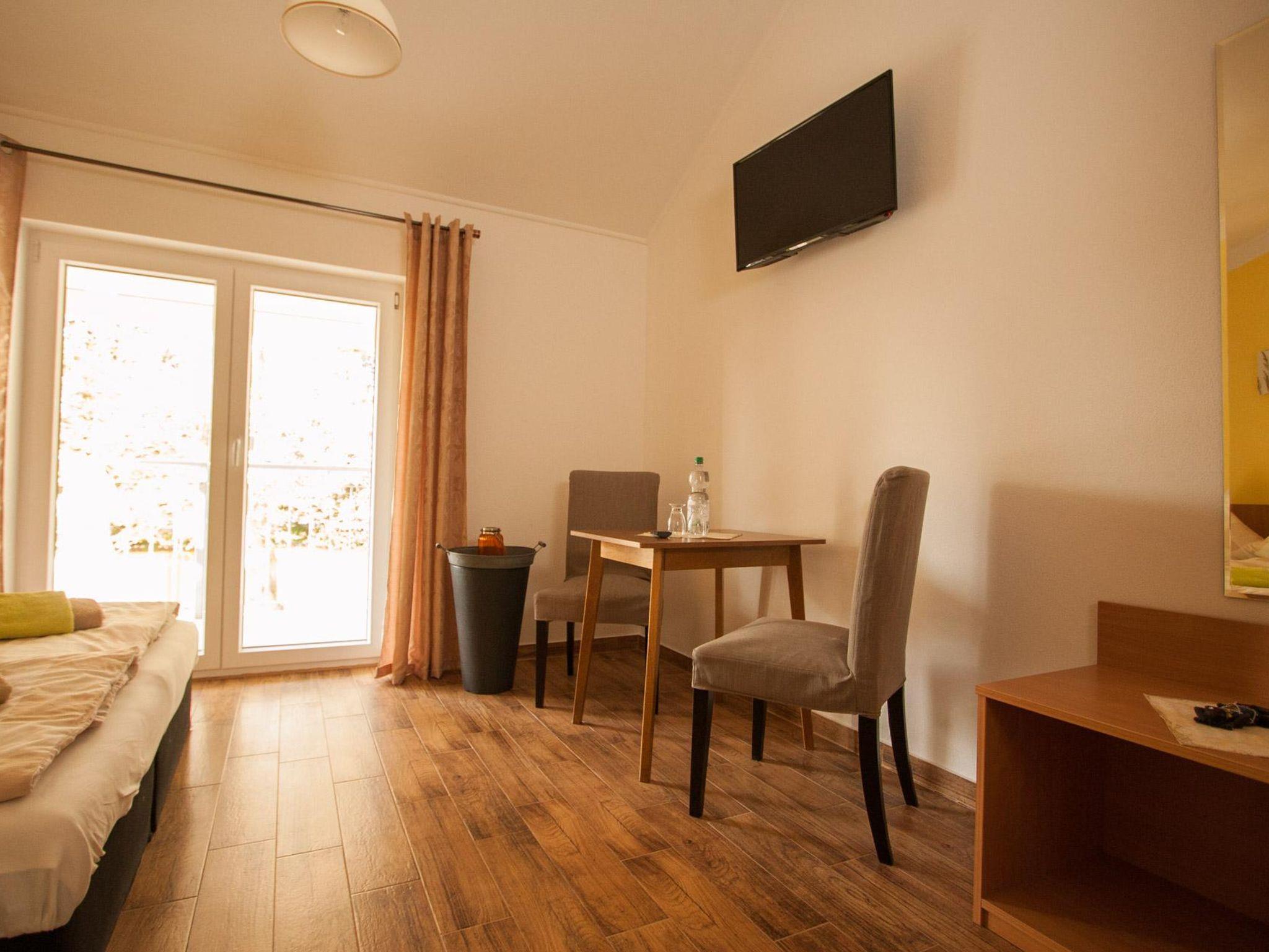 Es ist zudem schön hell, hat einen Balkon mit Gartenblick, Sat-TV, freies WLAN, großen Schrank und 2 Sitzgelegenheiten mit Tisch. Wie alle Zimmer haben Sie auch hier ein modernes Bad mit Dusche.