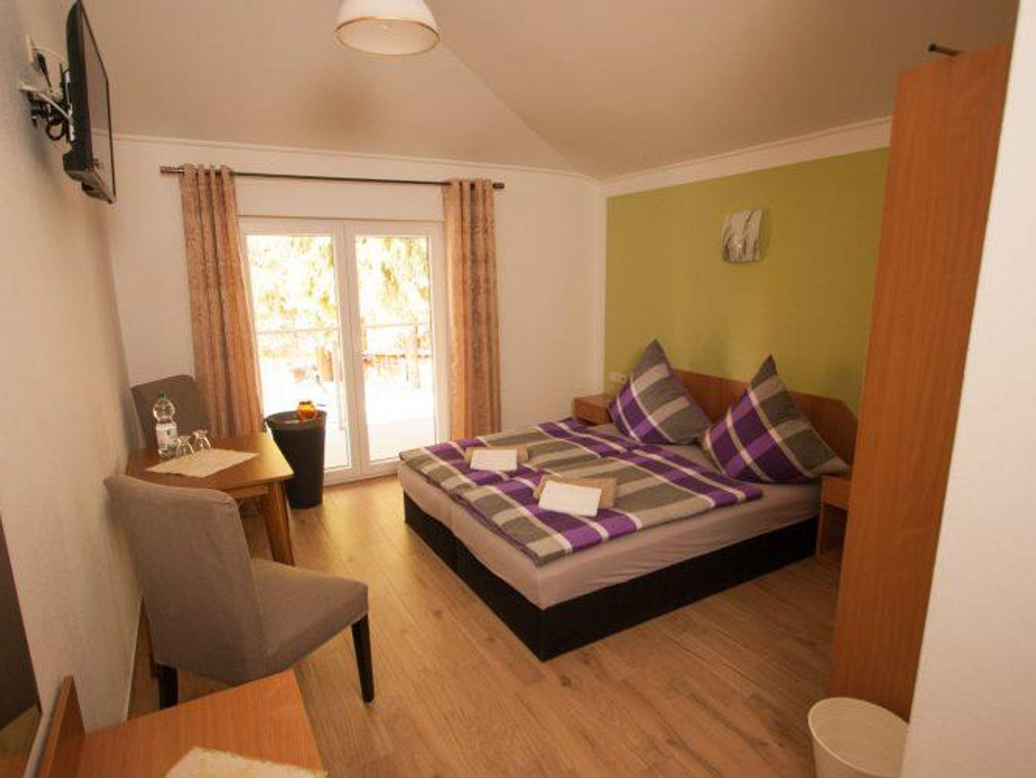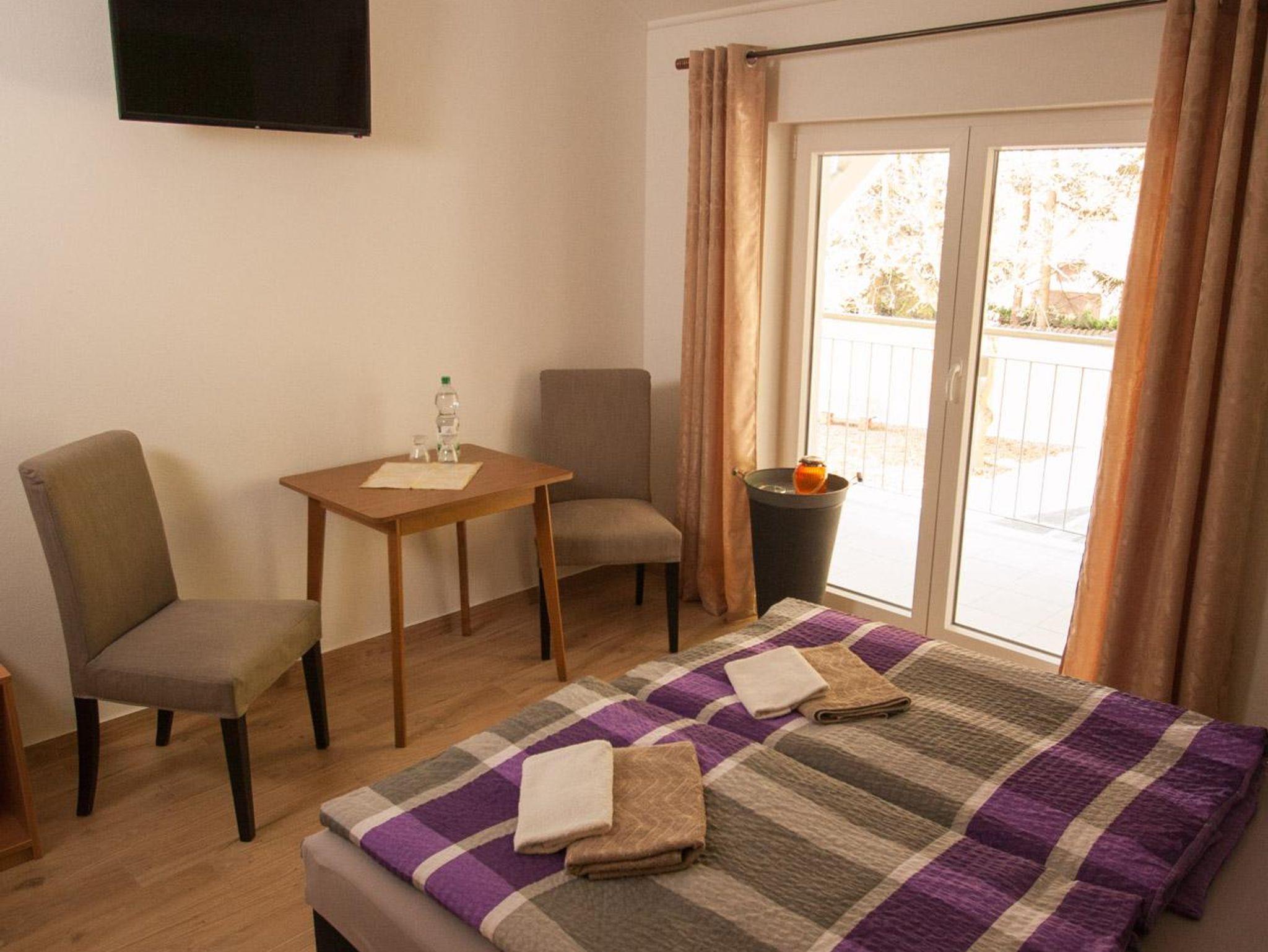 Unser „Zimmer 1“ ist ein schönes, helles Doppelzimmer mit Balkon und Blick auf den Garten. Zudem bietet es ein modernes Bad mit Dusche, Sat-TV, WLAN und 2 Sitzgelegenheiten mit Tisch. Es ist auch als Einzelzimmer buchbar.