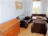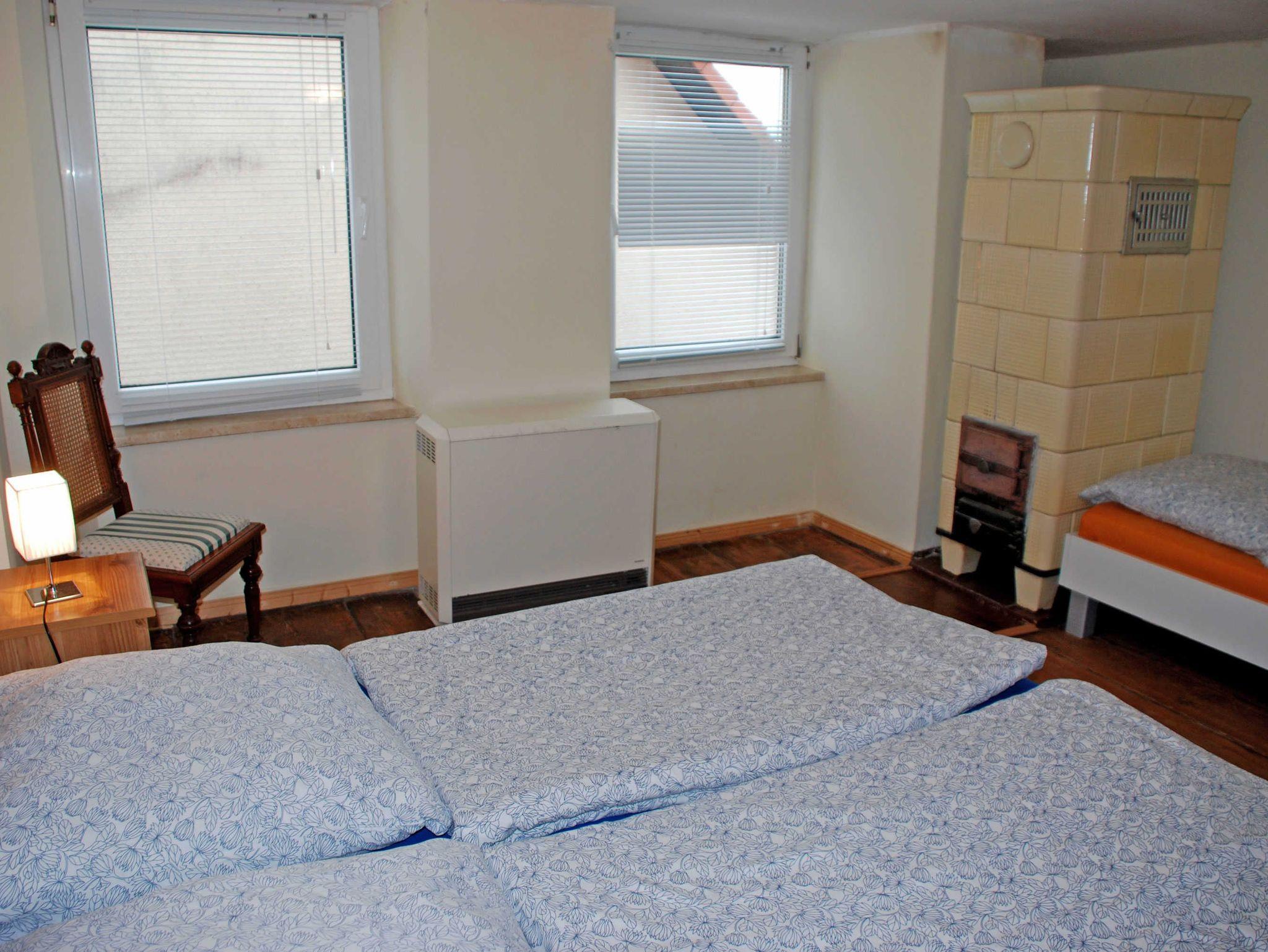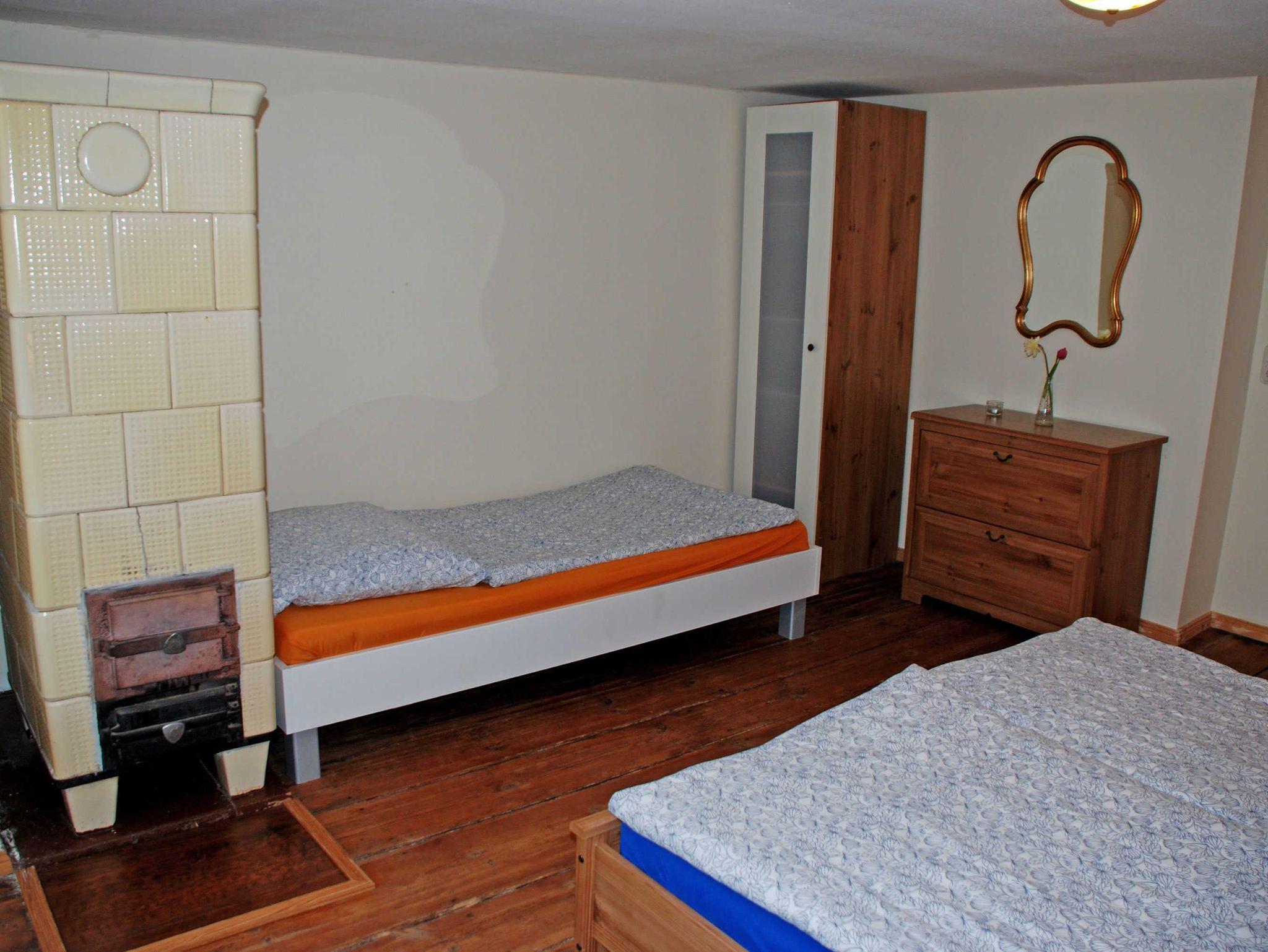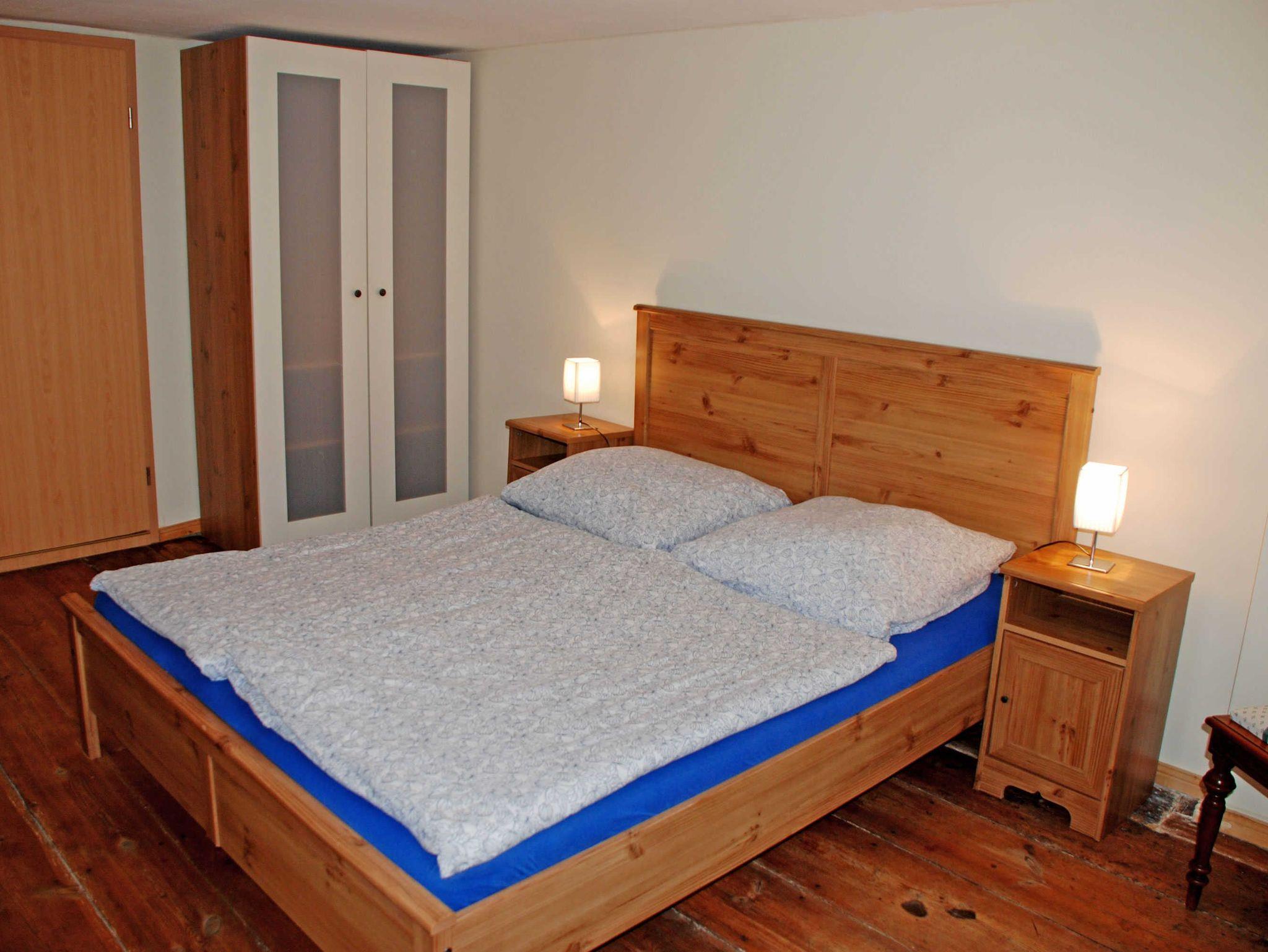Sie verfügt über einen separaten Eingang und WLAM. Im Wohnzimmer befinden sich eine Sitzcouch mit Sesseln und Tisch, ein Schrank und ein TV-Gerät. Ein besonderes Flair erhält diese Wohnung durch den vorhandenen Kachelofen, der besonders im Winter Behaglichkeit bietet. In der Küche finden Sie neben einem Esstisch mit Stühlen, einen Herd mit Backofen, Mikrowelle, Kaffeemaschine, Wasserkocher, Toaster und Tiefkühl- und Kühlschrank. Im ersten Schlafzimmer stehen ein bequemes Doppelbett (1,80 x 2,00 m) mit Nachttischen und Leselampen, eine Liege sowie ein Kleiderschrank.