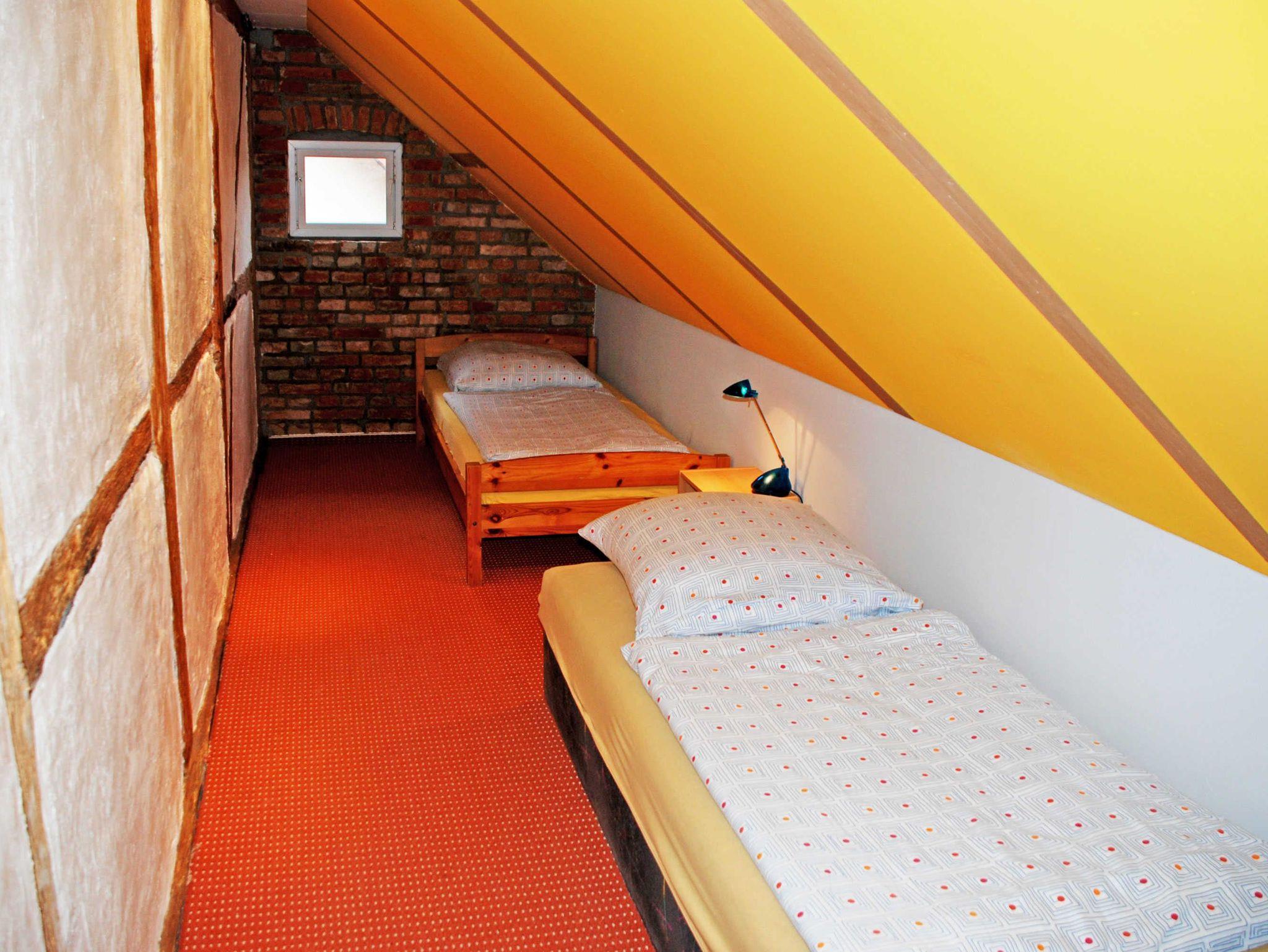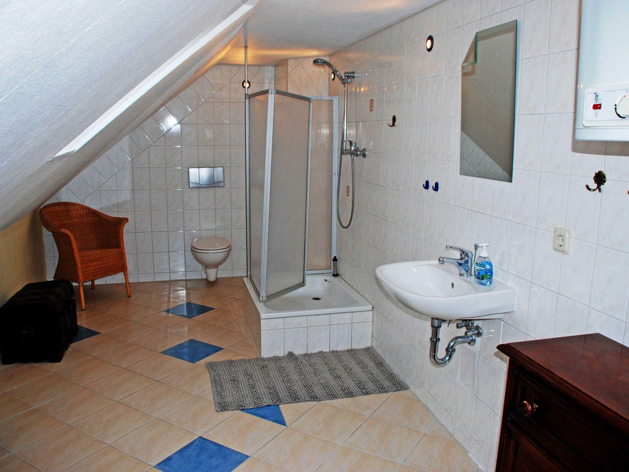 Im zweiten Schlafzimmer, eine kleine Kammer mit Dachschrägen, stehen zwei Einzelbetten (0,90 x 2,00 m). Das große Bad verfügt über Dusche, W, Waschmaschine und Waschtisch und hat Tageslicht. Als besonderes Extra liefern wir Ihnen auf Wunsch jeden Morgen kostenlos frische Bäckerbrötchen. Liebe Haustiere sind bei uns ebenfalls und jederzeit ohne Aufpreis in dieser Ferienwohnung willkommen. Bei Ihrer Anreise liegen frische Handtücher bereit und die Betten sind selbstverständlich bereits mit Bettwäsche bezogen.