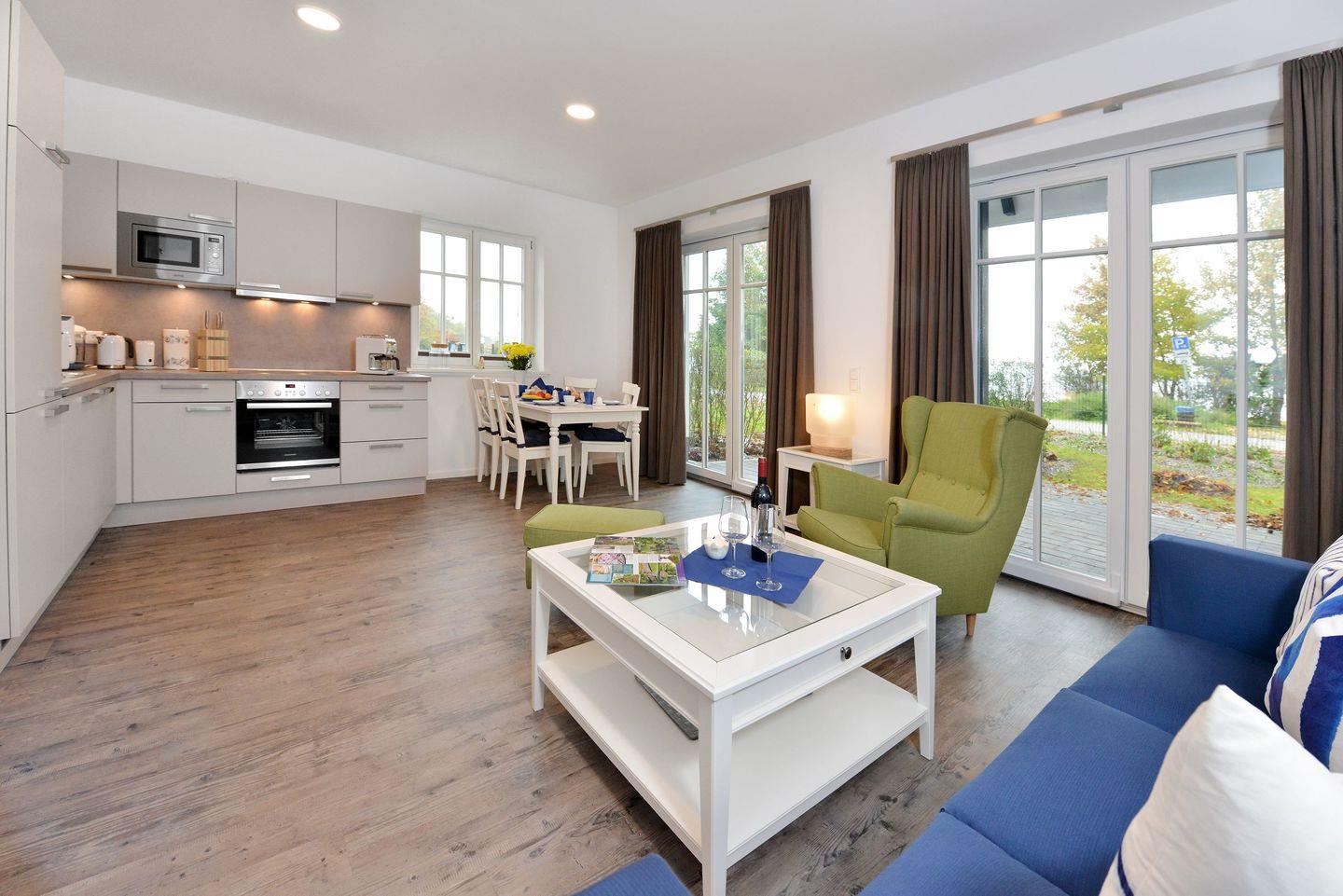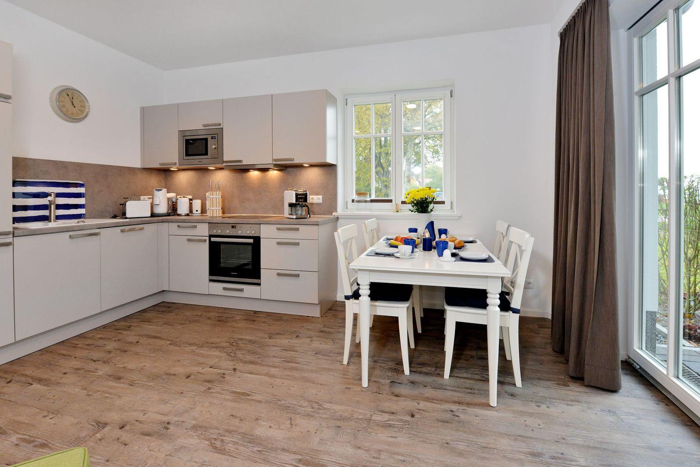 Das großzügige Wohnzimmer lädt zum Verweilen ein und geht nahtlos in eine moderne, voll ausgestattete Küche über. Ob ein ausgiebiges Frühstück oder ein selbst gekochtes Abendessen – mit Herd, Backofen, Geschirrspüler, Mikrowelle, Wasserkocher, Toaster, Kaffee- & Senseomaschine, Milchschäumer sowie Mixer und Pürierstab bleiben keine Wünsche offen.