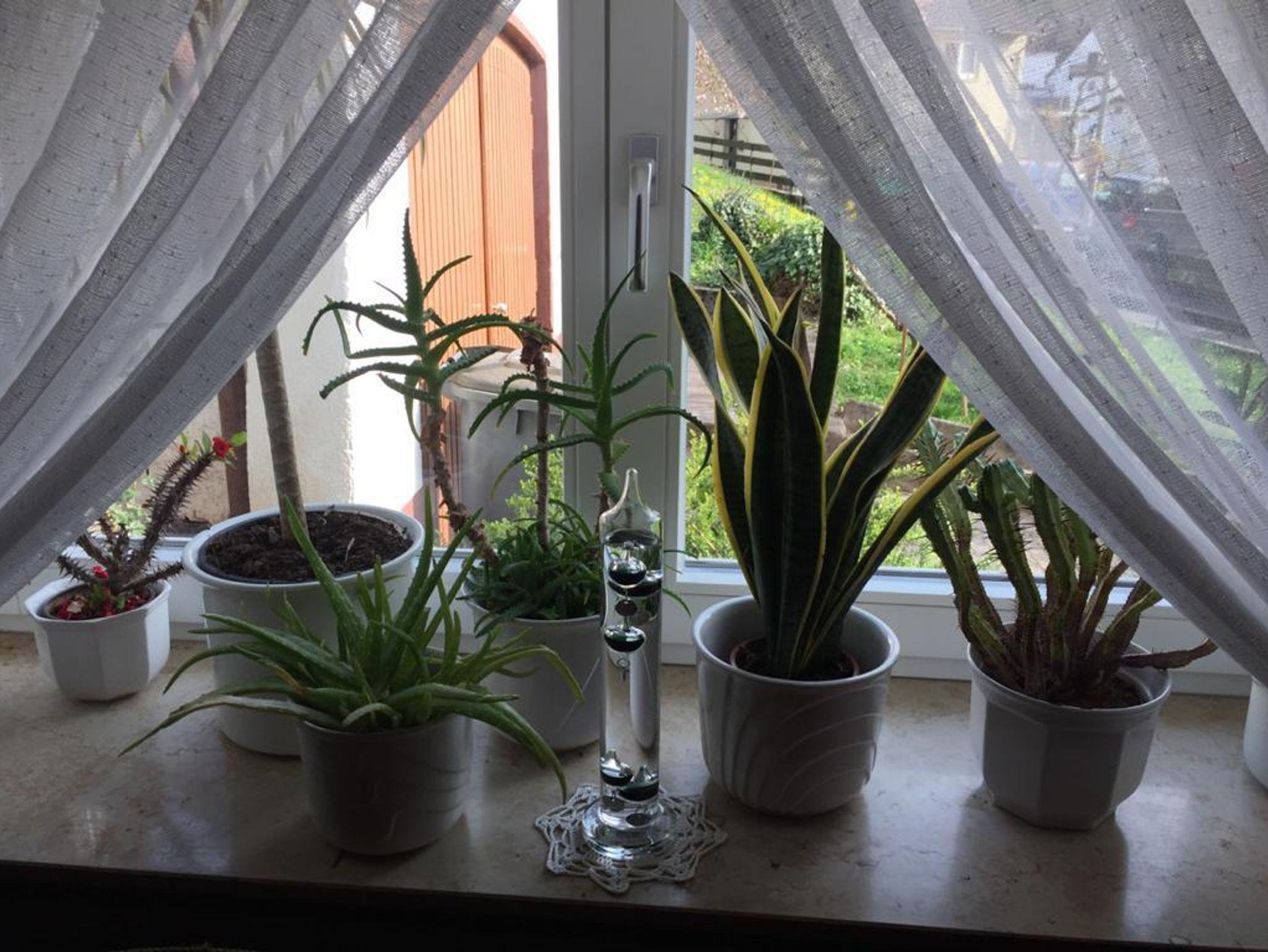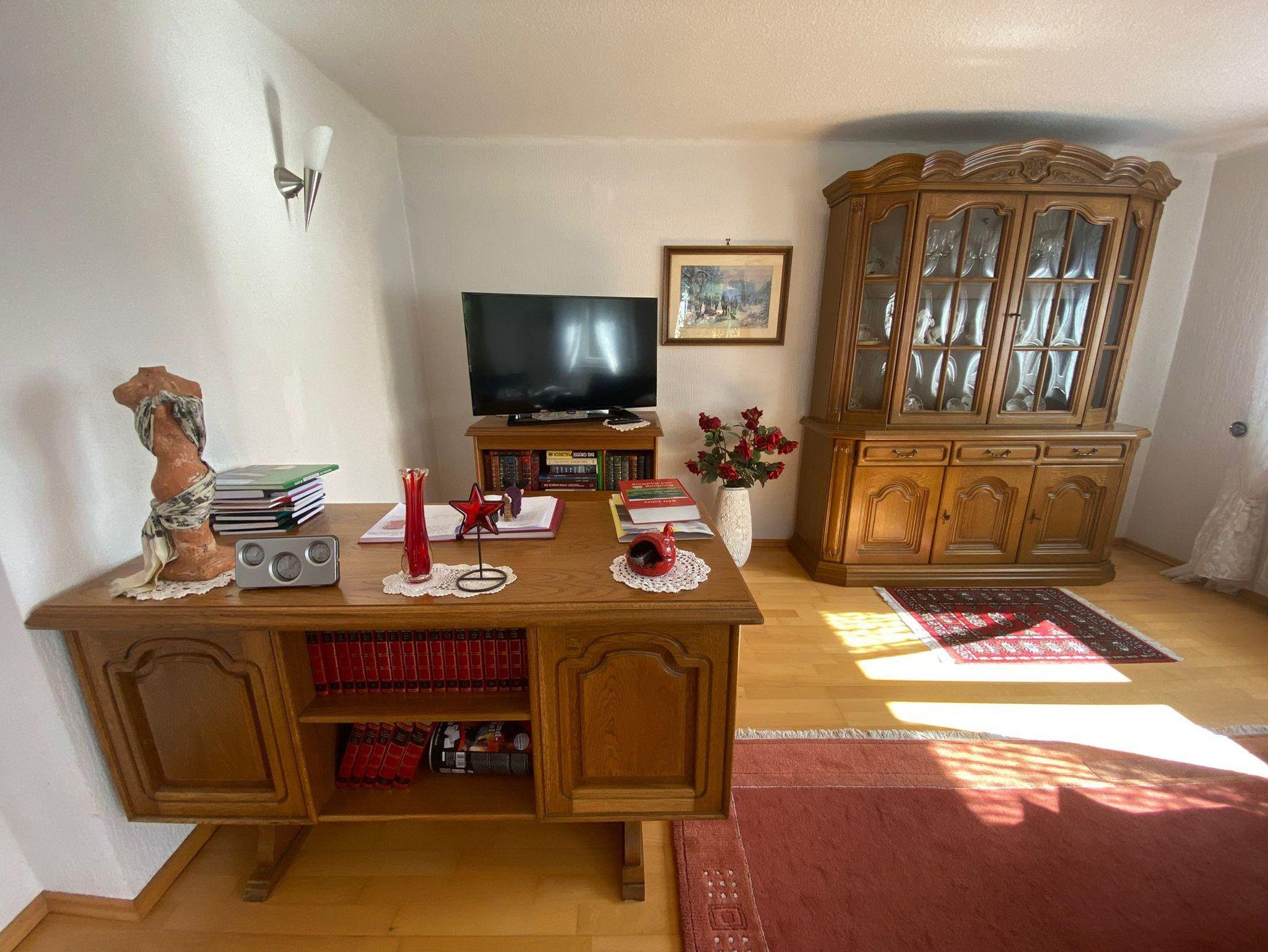Wohnzimmer mit Parkett, Blumen und Teppiche, Fernseher, DVD Player und Kaminsichtfensterofen.
