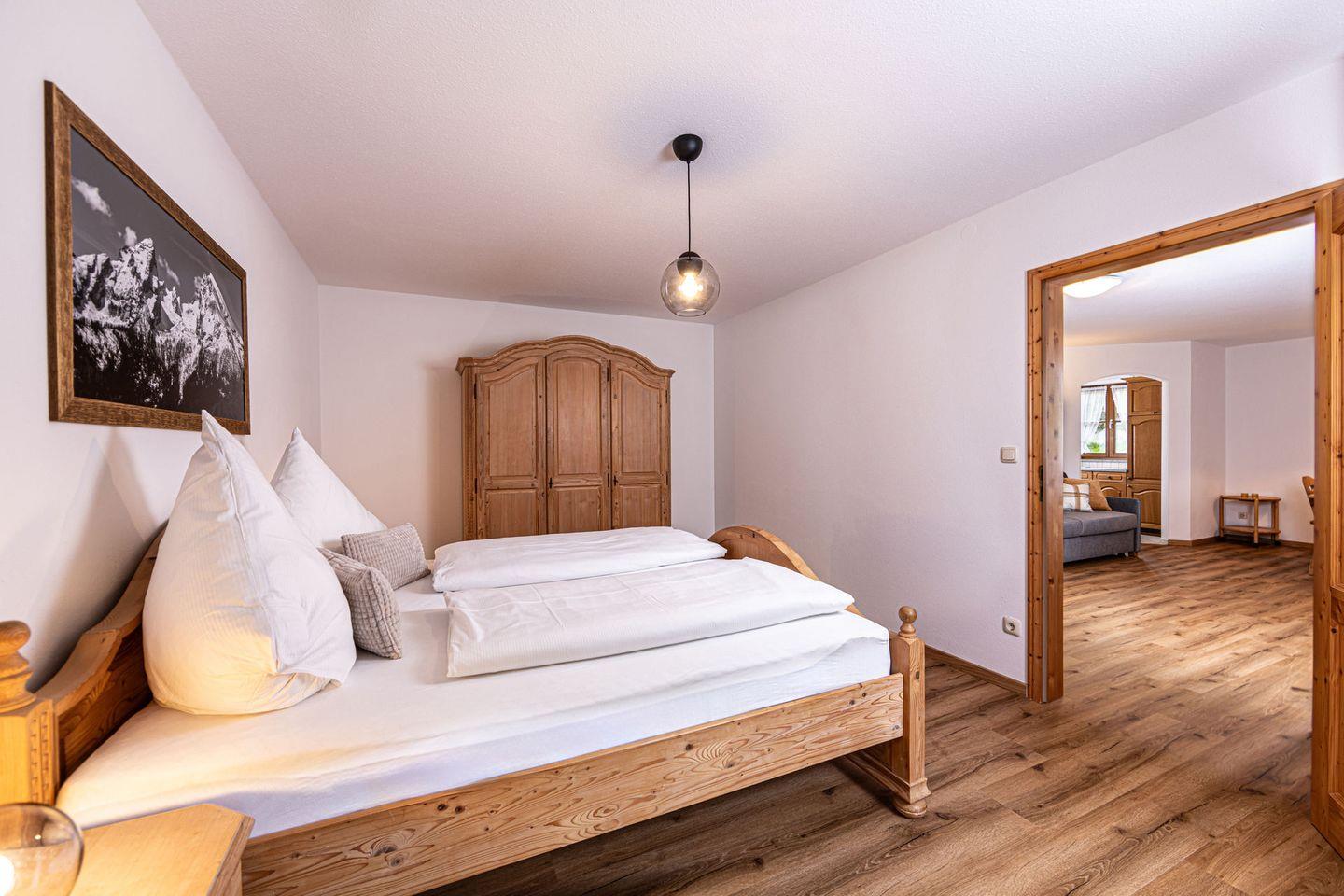Willkommen in der Scheffmannlehen Ferienwohnung Nr. 4, Ihrem perfekten Rückzugsort in der malerischen Landschaft von Ramsau bei Berchtesgaden. Diese gemütliche und geschmackvoll eingerichtete Ferienwohnung bietet Ihnen auf 50 m² Platz für bis zu 4 Personen und ist der ideale Ort für Familien oder Paare, die die Schönheit der bayerischen Alpen erleben möchten. Sie betreten den offenen Wohnbereich, der eine harmonische Verbindung von Küche und Wohnzimmer schafft. Die voll ausgestattete Küche verfügt über einen 4-Platten-Herd, einen Backofen, einen Kühlschrank mit Gefrierfach, sowie alle notwendigen Küchenutensilien. Der Essbereich mit Esstisch lädt zu gemeinsamen Mahlzeiten ein, während die Sofaecke (Schlafsofa) mit TV im Wohnzimmer zum Entspannen einlädt. Gratis WLAN und ein Parkplatz stehen zur Verfügung. Das Schlafzimmer mit Doppelbett und ein Badezimmer mit Dusche, WC und Haartrockner runden das komfortable Wohnerlebnis ab. Besonders hervorzuheben ist der überdachte Balkon.
