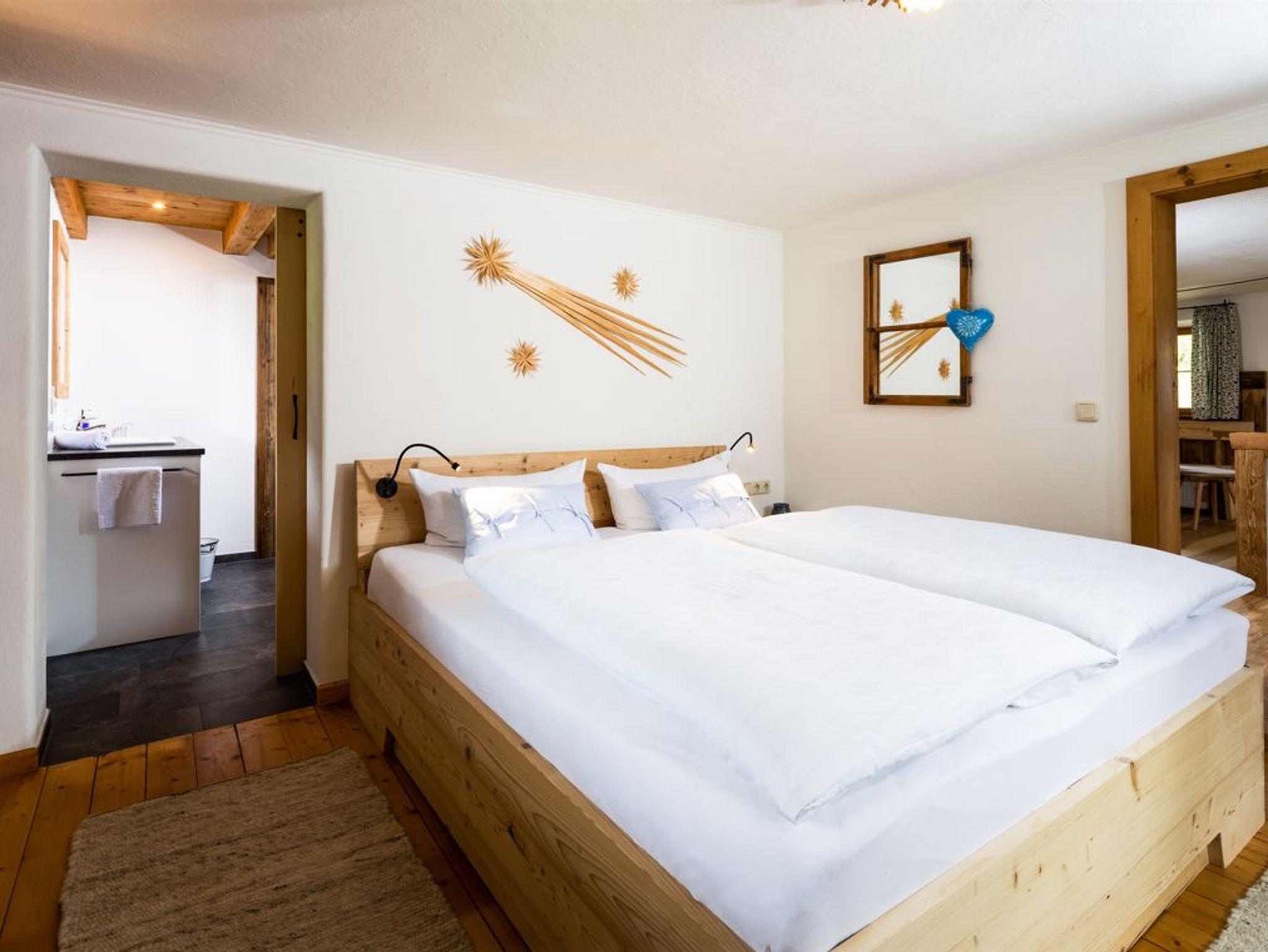 Unsere liebevoll renovierte Nichtraucher-Ferienwohnung, traditionell und denkmalgeschützt (Massivholzmöbel, Holzdecken und -böden) mit allem sonstigen Komfort eingerichtet, vermittelt eine unvergleichlich heimelige und gemütliche Atmosphäre. Der großzügige Süd-Ost-Balkon bietet Ihnen einen gigantischen Panoramablick auf die gesamte Bergwelt. Die Bettengröße beträgt 0,90 x 2,00 m. Die Wohnung befindet sich im 1. Stock im Zuhäusl (angrenzendes Nebengebäude). Der Internetzugang steht Ihnen im Haupthaus zur Verfügung.