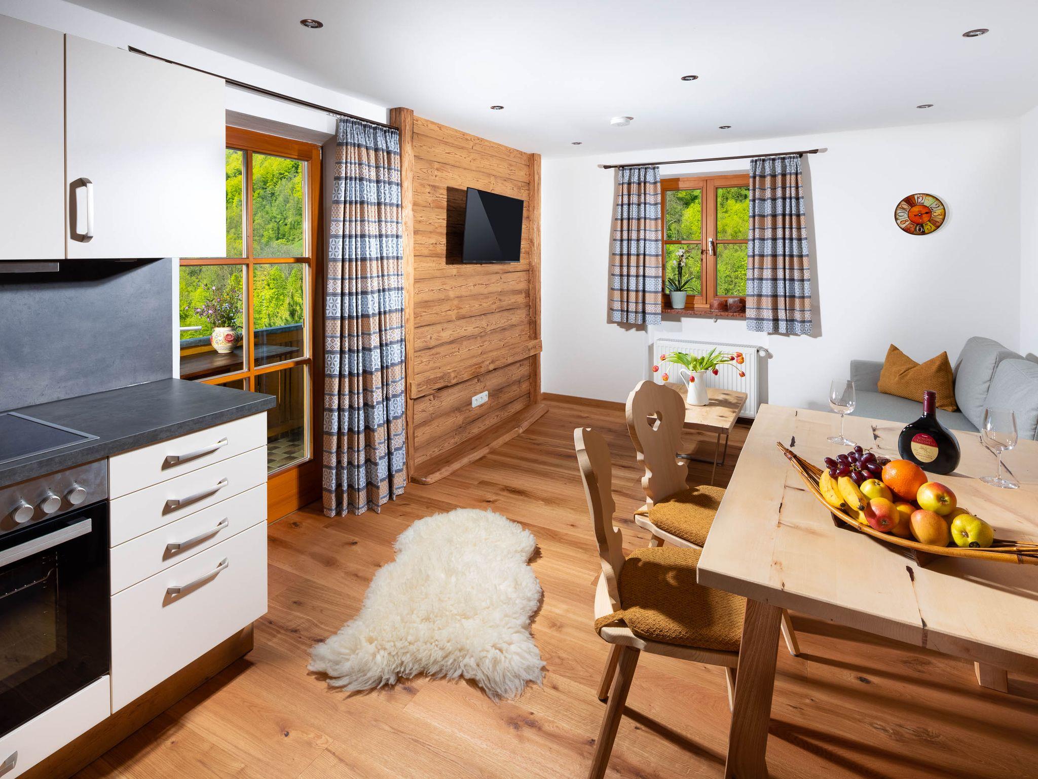 Fühlen Sie sich wie zu Hause in unserer neuen, gemütlichen Ferienwohnung. Diese hat ca. 65 qm. Uns liegt es am Herzen, hauptsächlich Naturmaterialien wie Altholz von eigener Alm, Naturholzböden, Leinen und Filz zu verwenden. Im Wohnzimmer befindet sich ein Flat Screen TV, Stereoanlage, DVD-Player, große Schlafcouch für 2 Personen und ein Zugang zum eigenen Balkon.