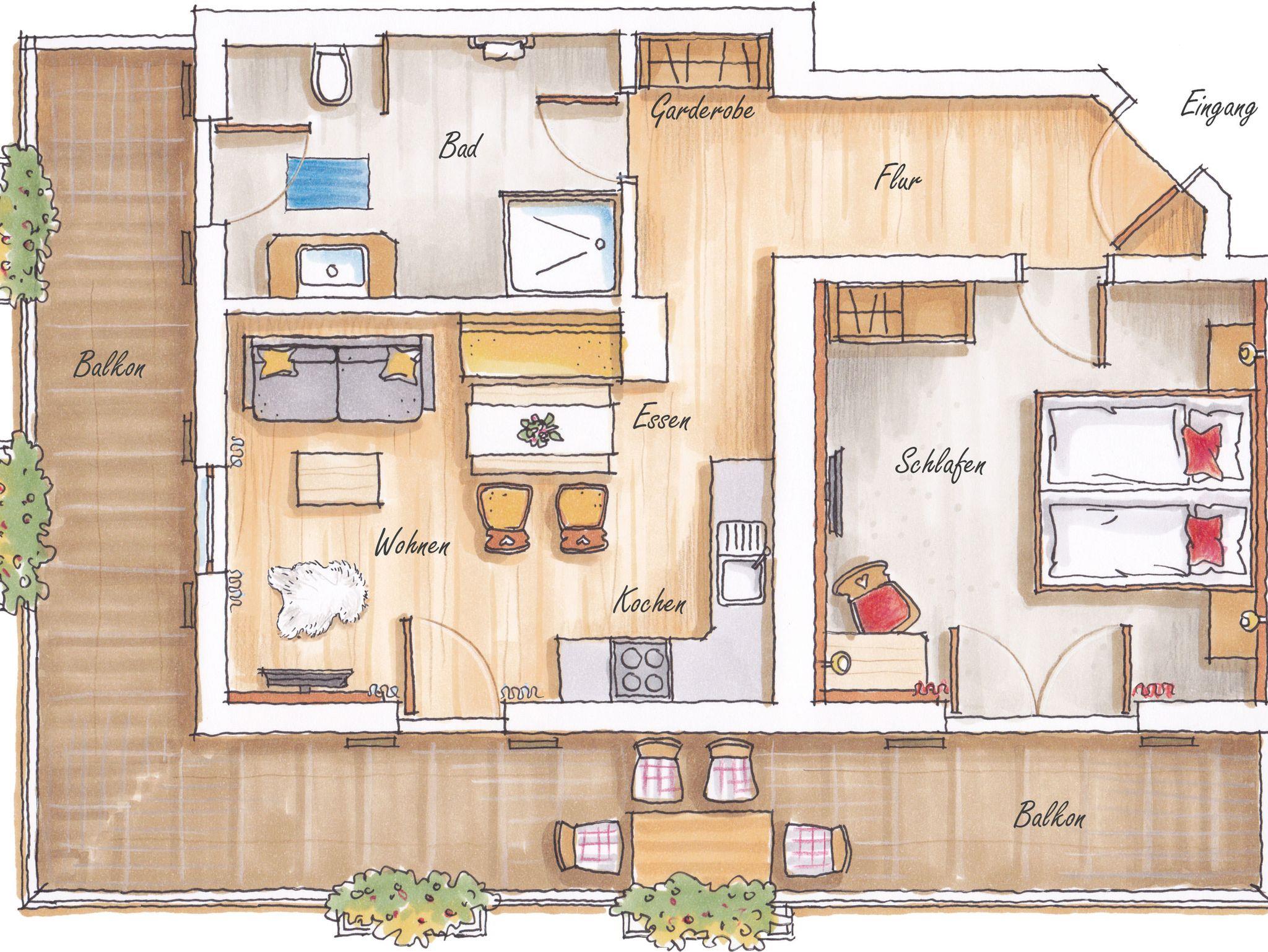 Gästehaus Anfanglehen, Ferienwohnung Kühroint, 1-2 Personen, 65 qm, Balkon, separates Schlafzimmer, Obergeschoss