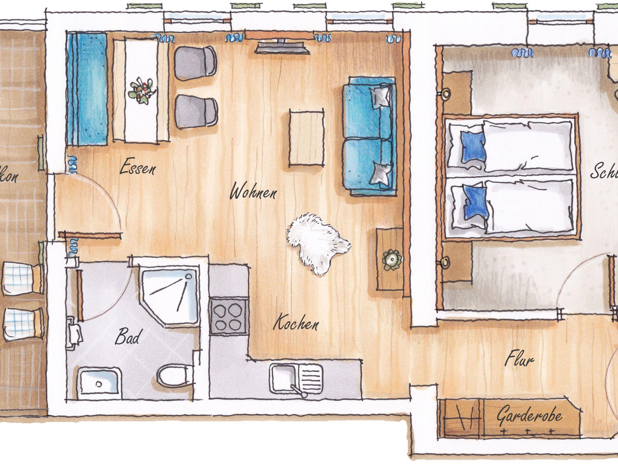 Der modern gestaltete Wohn-Essbereich ist komplett eingerichtet, u. a. mit einer Geschirrspülmaschine, Cerankochfeld , Backofen, Kaffeemaschine… Für einen erholsamen Schlaf sorgt das verarbeitete Zirbenholz im separaten Schlafzimmer. Das moderne Bad ist mit einer Dusche, einem WC und einem Waschtisch ausgestattet. Der eigene gemütliche Balkon bietet Ihnen die Möglichkeit, ein gemütliches Frühstück zu genießen oder den Tag mit einem Gläschen Wein ausklingen zu lassen.