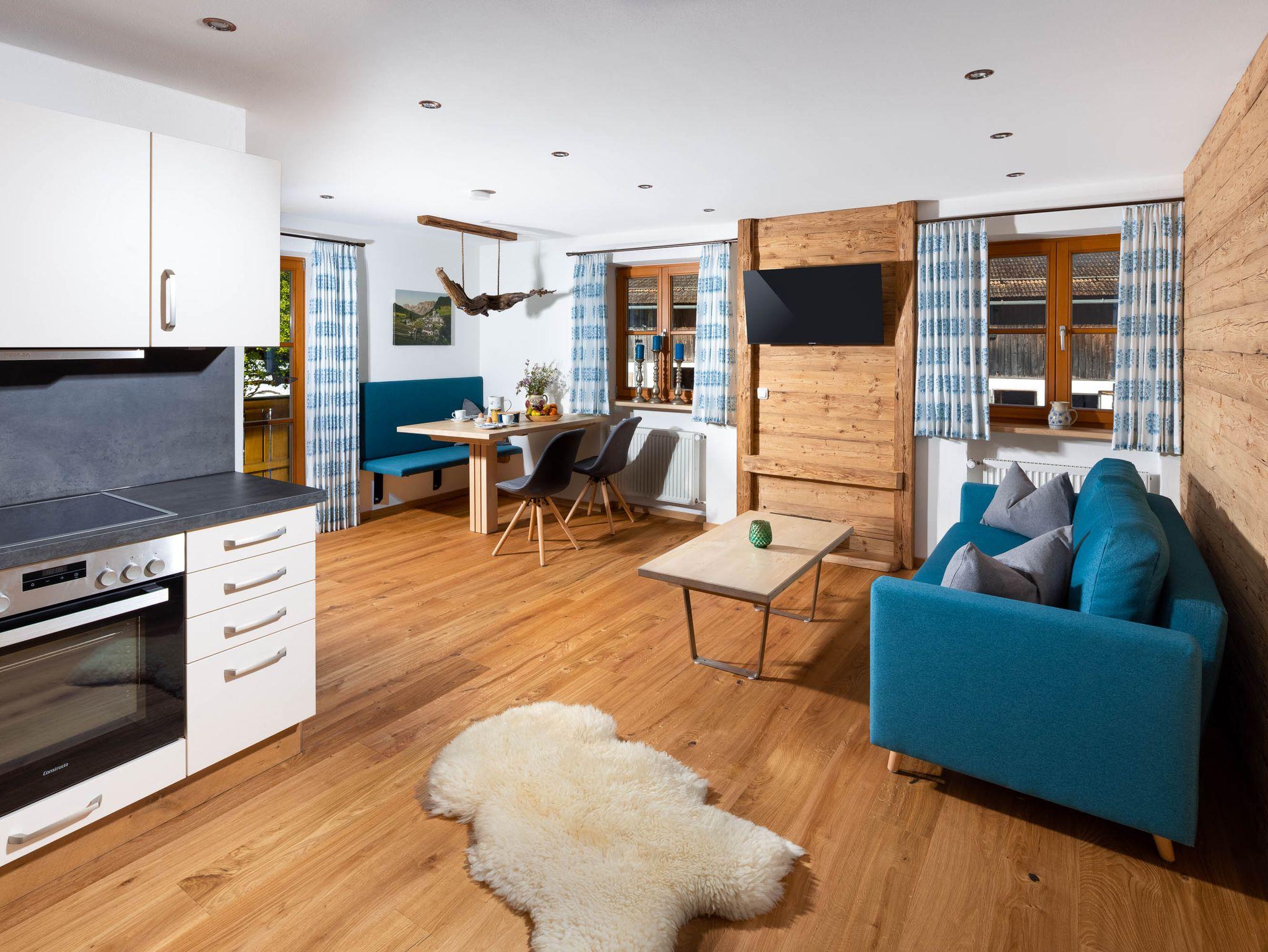 Fühlen Sie sich wie zu Hause in unserer neuen, gemütlichen Ferienwohnung. Diese hat ca. 65 qm. Uns liegt es am Herzen, hauptsächlich Naturmaterialien wie Altholz von eigener Alm, Naturholzböden, Leinen und Filz zu verwenden. Im Wohnzimmer befindet sich ein Flat Screen TV, Stereoanlage, DVD-Player, große Schlafcouch für 2 Personen und ein Zugang zum eigenen Balkon.
