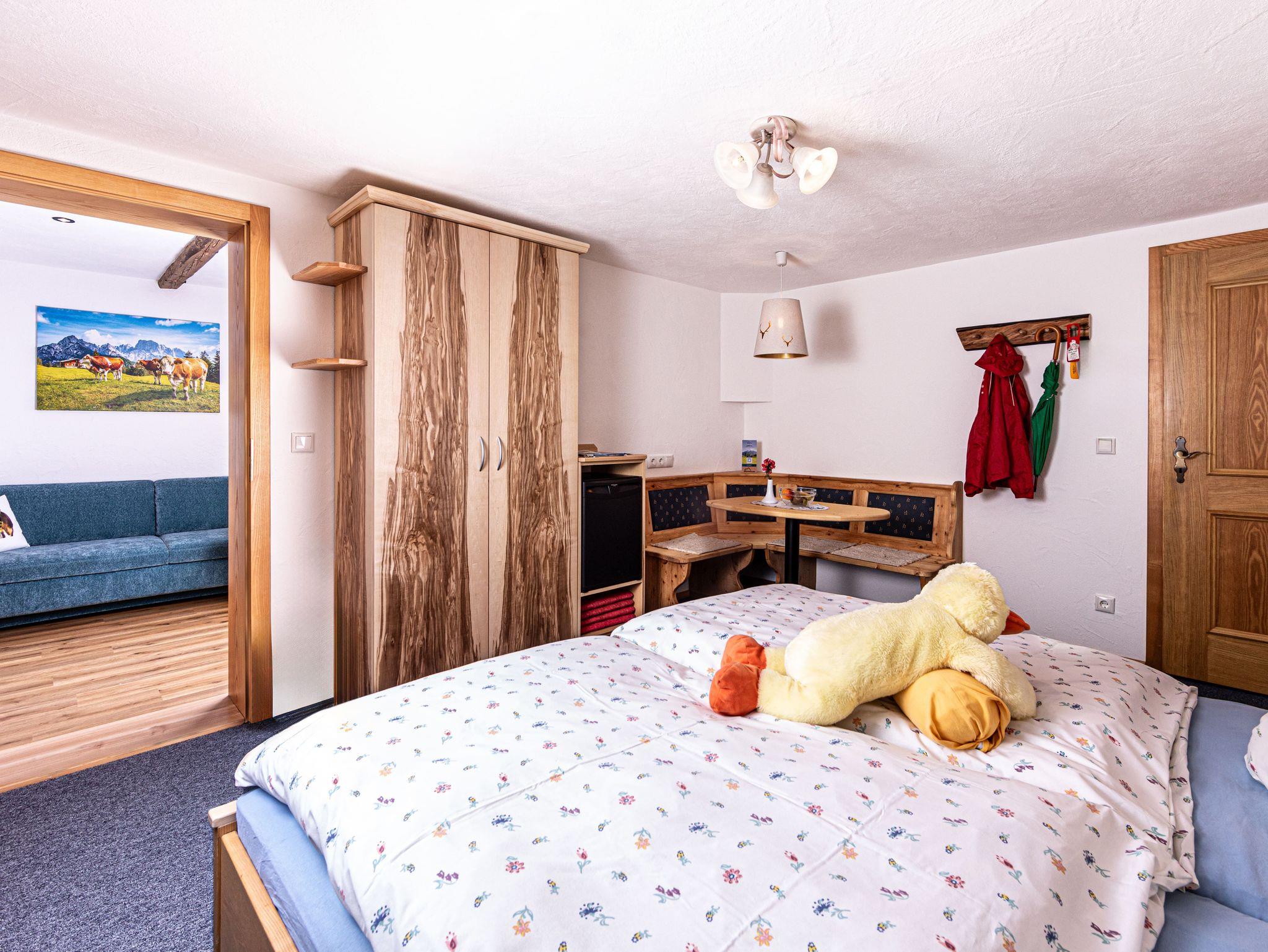 2 Zimmer-Suite, bestehend aus einem Schlafzimmer mit Doppelbett (Bettengröße 2,00 x 1,90 m), sowie einem separaten Wohnzimmer mit Schlafcouch. Die Suite ist zur Ostseite gelegen und mit Radiowecker, großem Flat-TV, Mini-Stereoanlage, Safe, Kühlschrank (keine Küche), Wasserkocher, Eckbank und Fön ausgestattet. Balkon mit Blick auf die Berge.