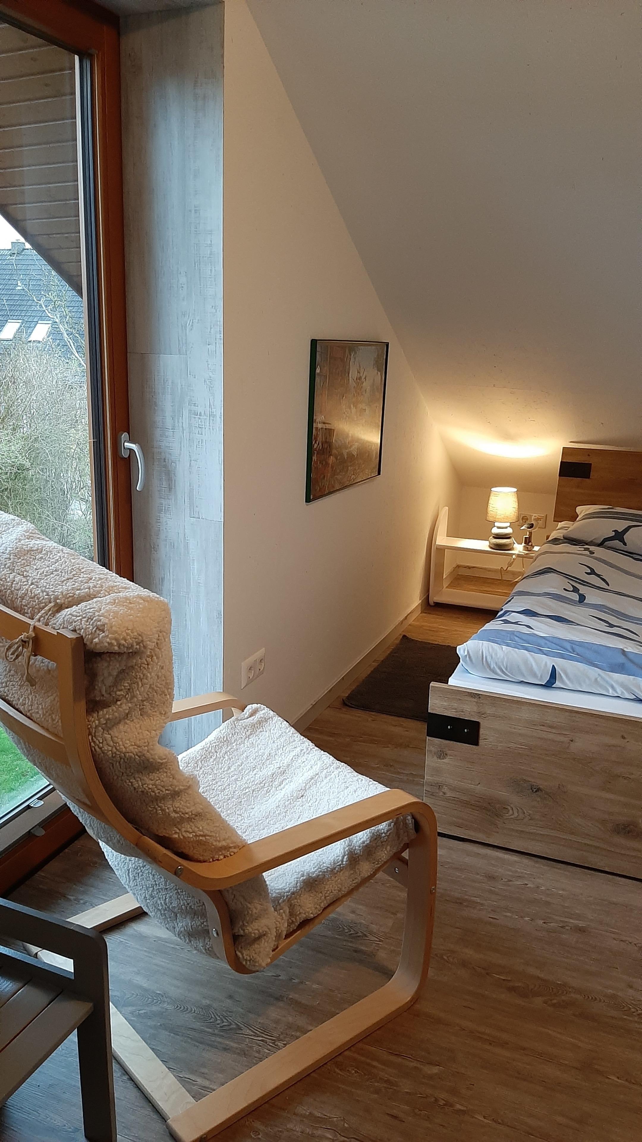 Ihre Wohnung befindet sich im Obergeschoss unseres Holzhauses in ruhiger Lage mit Blick in die nordfriesische Landschaft.
