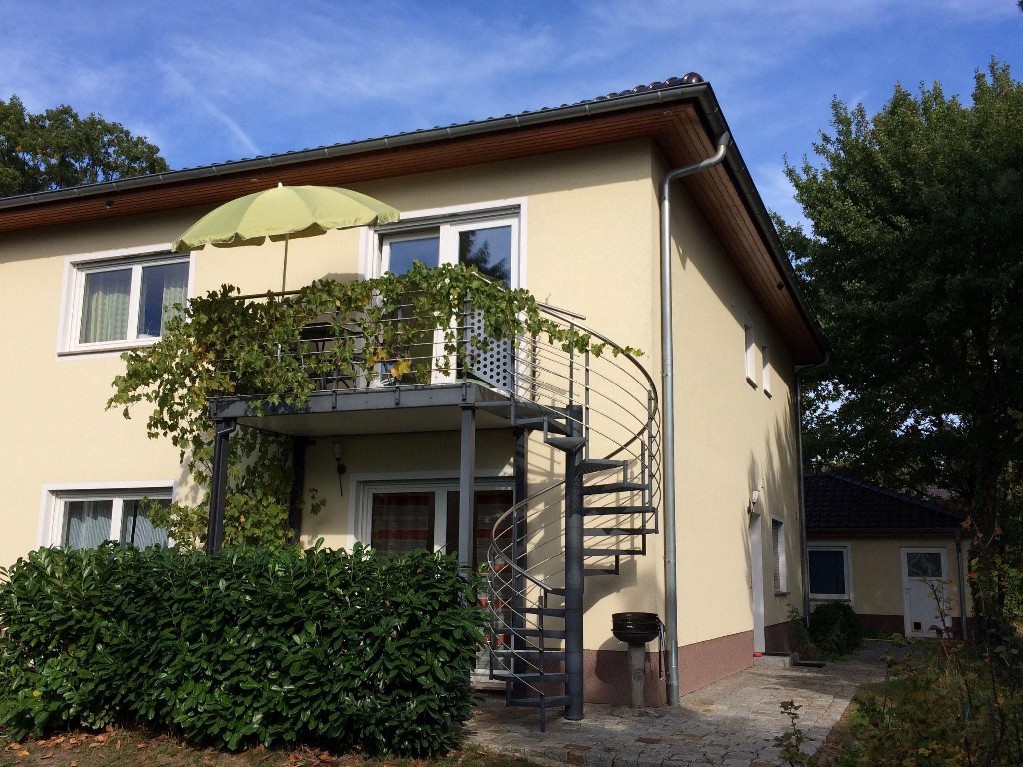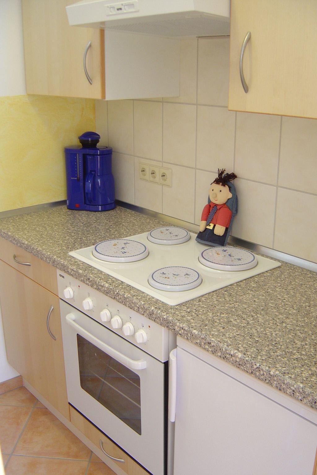 The holiday flat with separate entrance offers space for a maximum of five people and a baby. There is a bedroom with a double bed (160 cm x 200 cm) and two sofa beds (100 cm x 200 cm each) in the living room. An additional extra bed (80 cm x 200 cm) and a baby cot can also be provided. The living room and bedroom are fitted with solid wood flooring. There is also a dining table and a television with satellite TV in the living area. The kitchen has a 4-ring hob, oven, fridge, freezer and dishwasher. The brightly tiled bathroom is equipped with a bathtub with shower attachment, washbasin and WC. Free WLAN is also available.