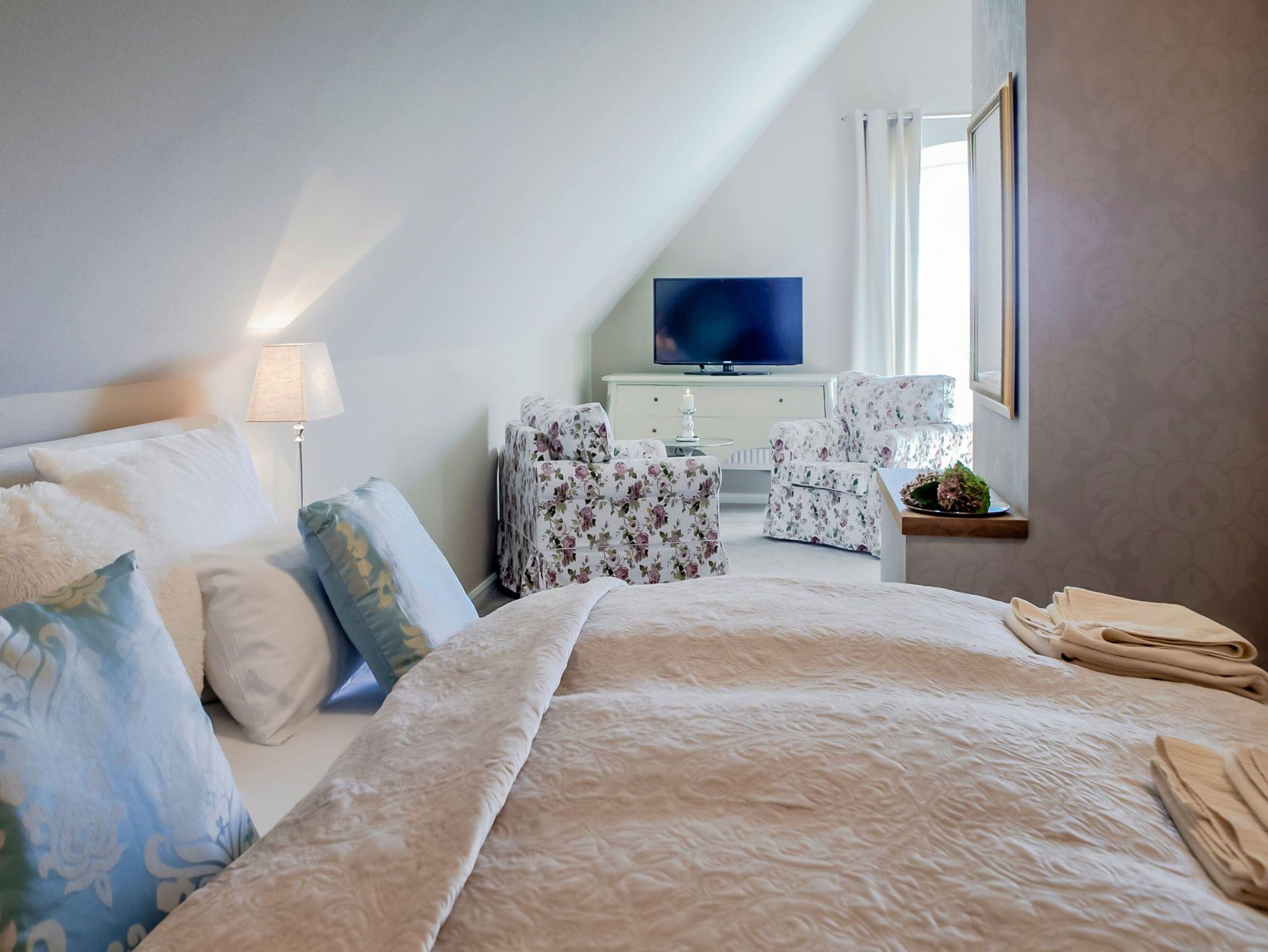 Für noch mehr Platz und Komfort können Sie die Mastersuite im Dachgeschoss hinzubuchen. Diese bietet ein drittes Schlafzimmer mit Boxspringbett und ein weiteres hochwertiges Badezimmer mit Dusche und WC. Preis: 30 € pro Tag. Der Zugang erfolgt bequem über eine Treppe innerhalb der Wohnung.