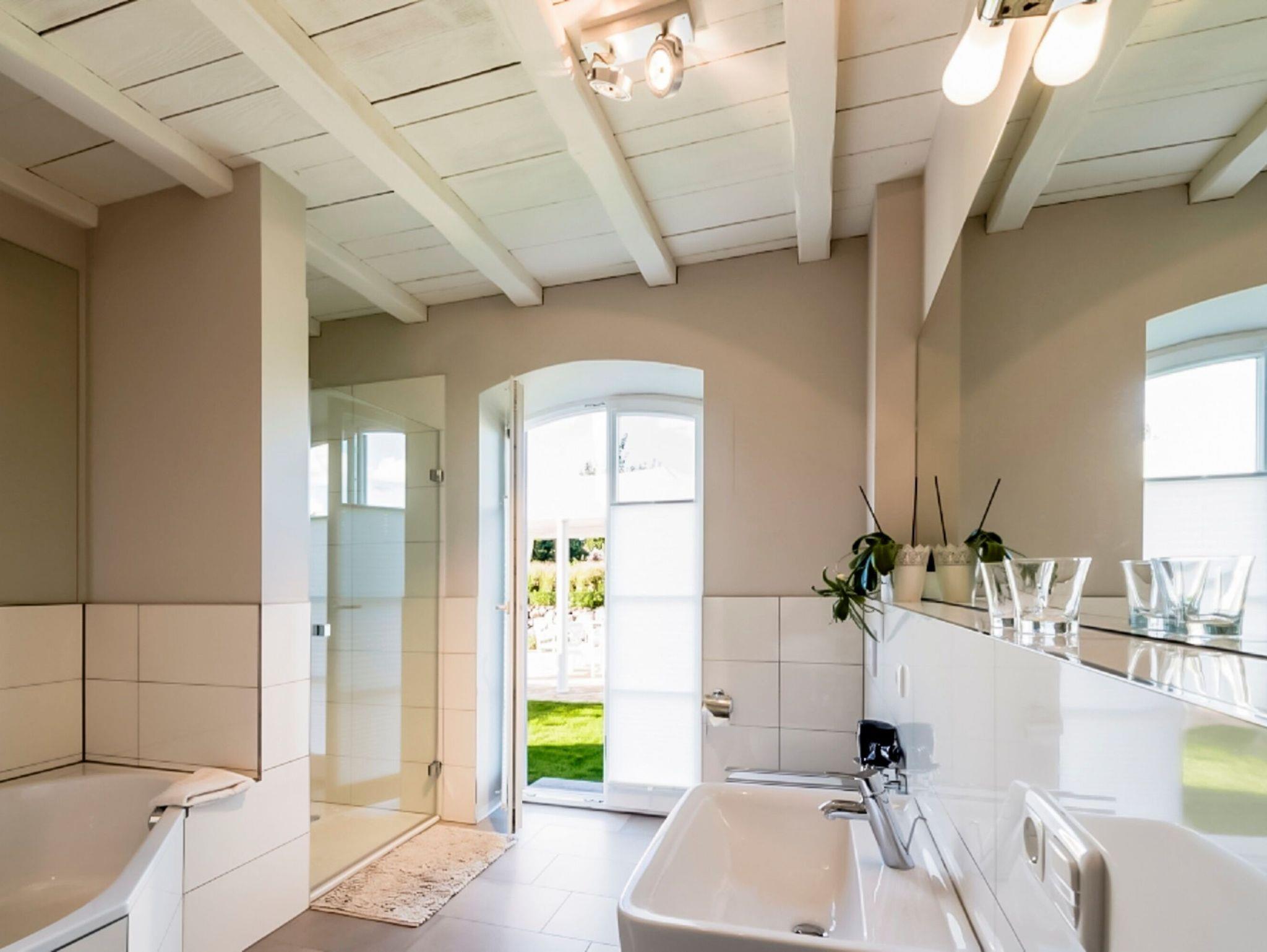 • Luxuriöses Badezimmer: Badewanne, Dusche, Waschtisch und WC sorgen für höchsten Komfort.