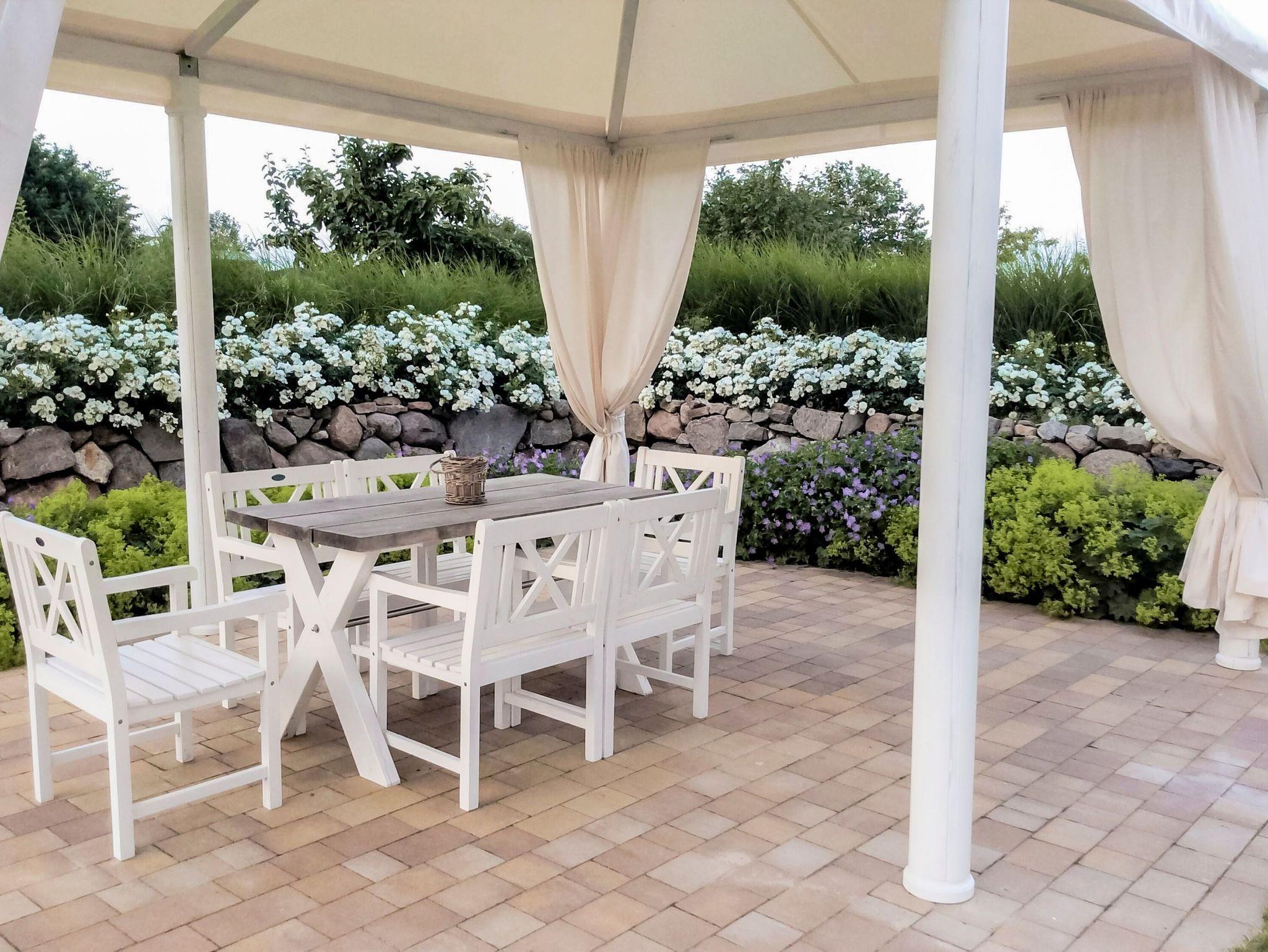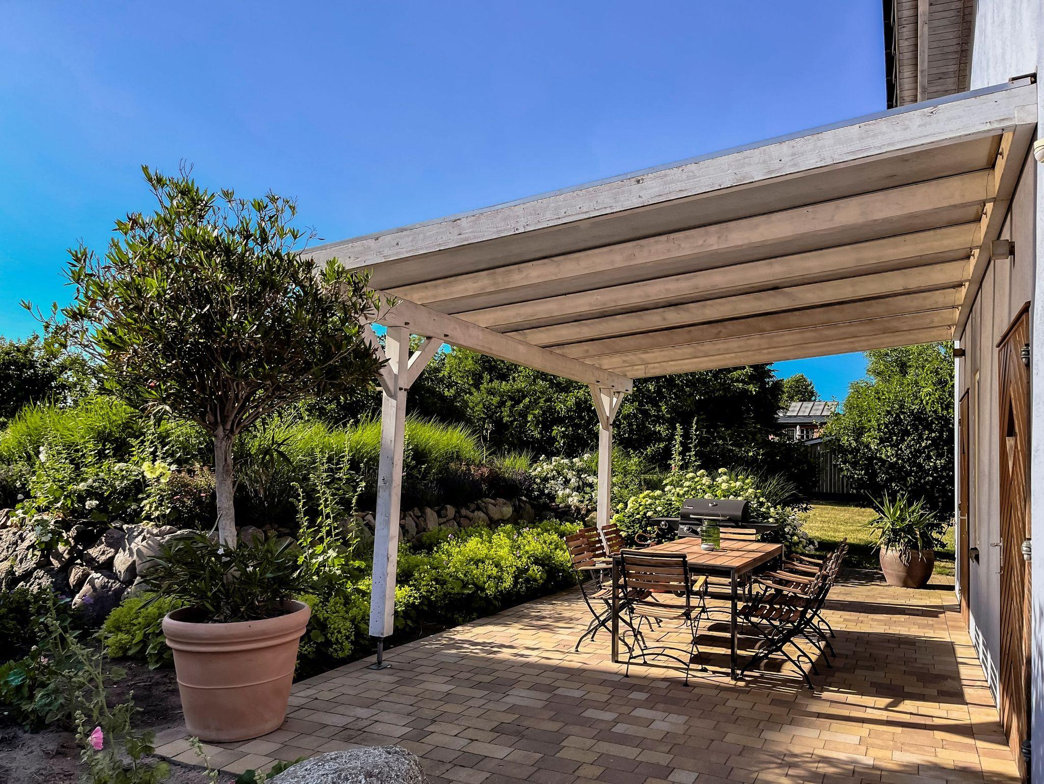 Ein besonderes Highlight dieses Appartements ist die private Terrasse mit Pavillon, die direkt von der Küche aus erreichbar ist. Genießen Sie hier exklusive Momente im Freien perfekt für ein Frühstück in der Morgensonne oder einen entspannten Abend bei Sonnenuntergang.