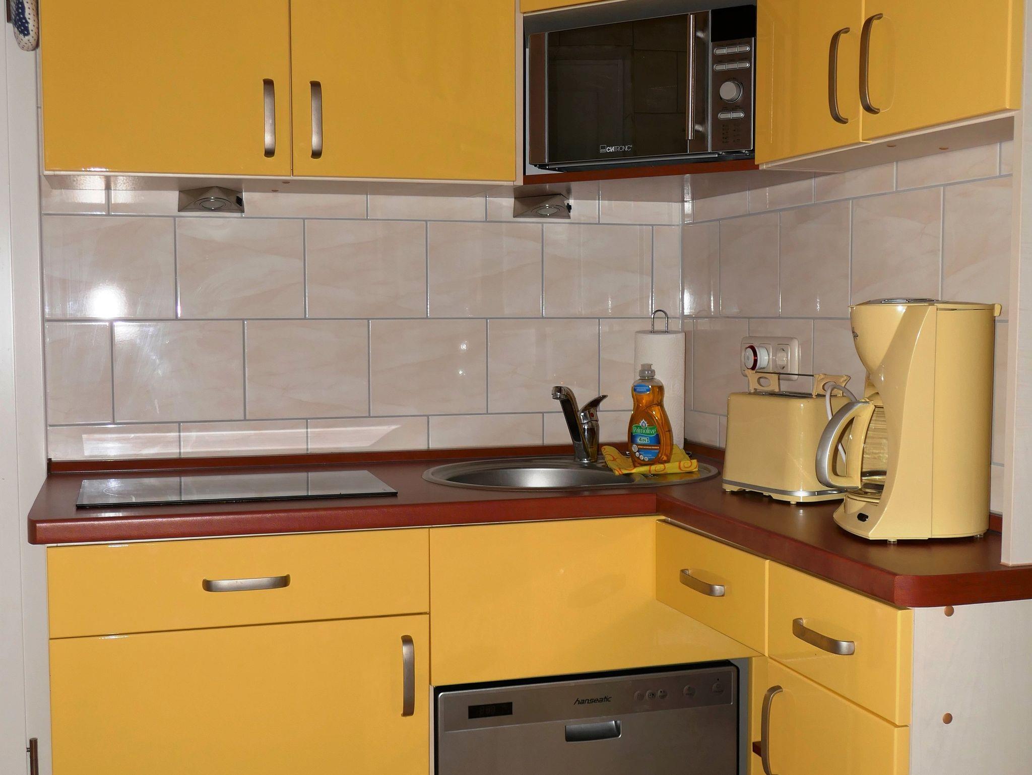 Die moderne und funktionale Küche verfügt über einen Ceranherd, eine Spülmaschine, Kaffeemaschine, Wasserkocher, Mikrowelle mit Aufbackfunktion, Toaster und Kühlschrank. Das Bad ist mit einem elektrischen Badheizer, Dusche/WC und Haartrockner ausgestattet. Für die kleinen Gäste steht kostenfrei ein Kinderreisebett, ein Hochstuhl, ein Toilettensitz und Kinderbesteck zur Verfügung.