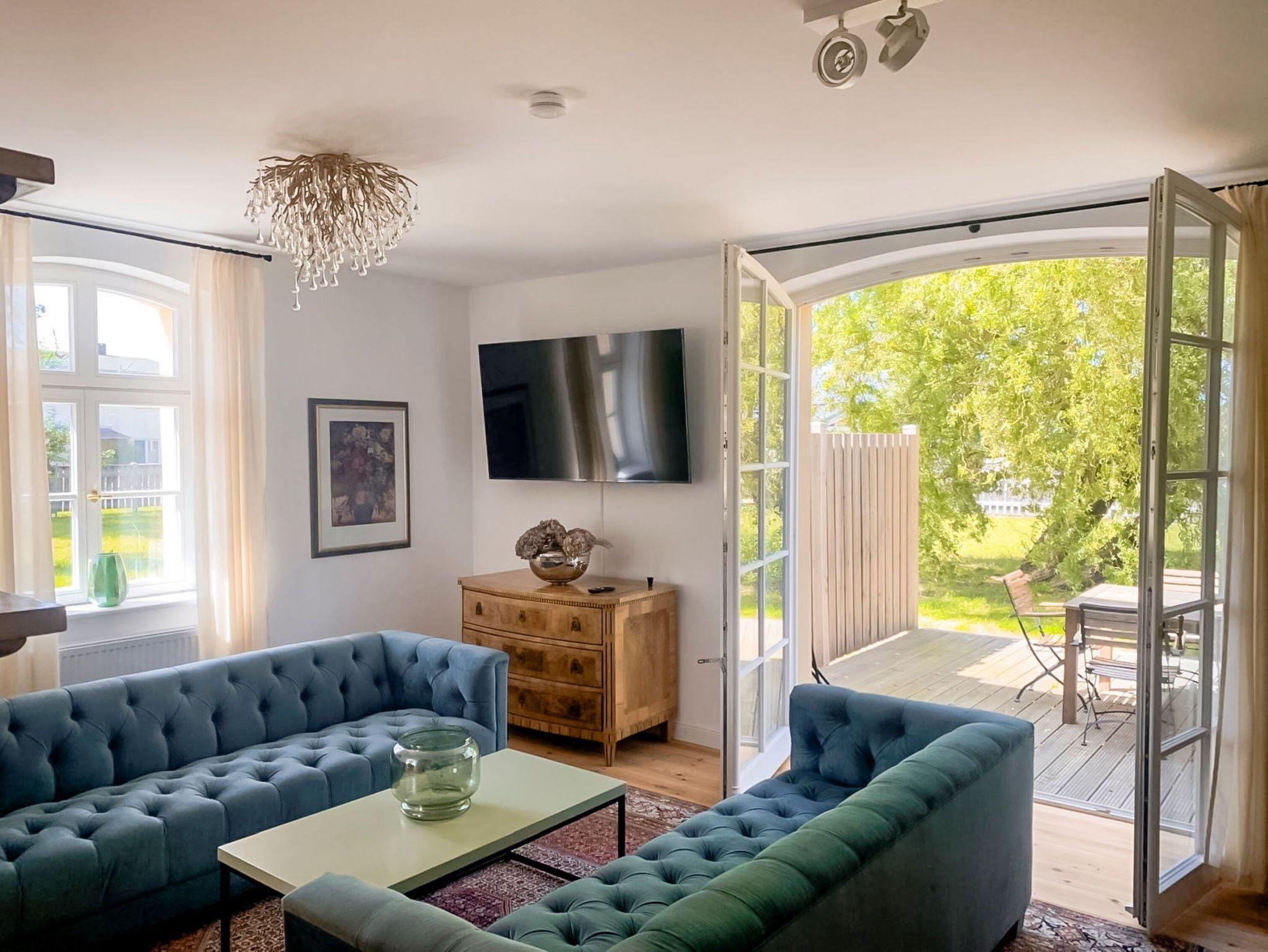 • Wohnzimmer mit Kamin: Lichtdurchflutet und gemütlich, mit TV-Flatscreen und einladender Sitzgarnitur.