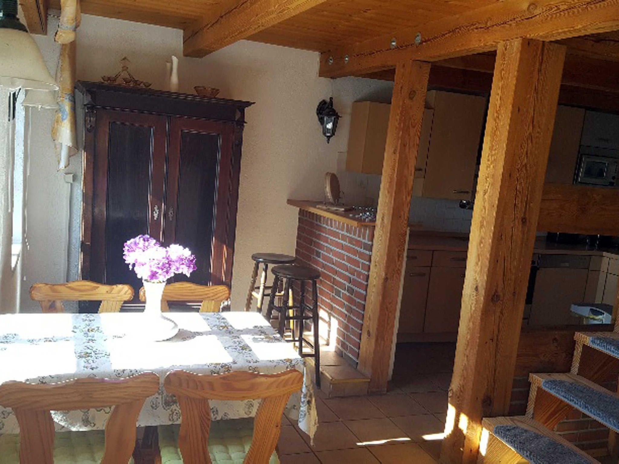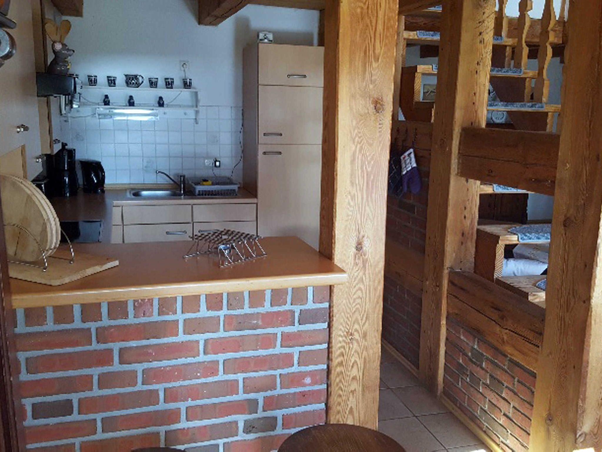 Auch der Innenbereich ist im Landhausstil gehalten. Im Erdgeschoss das Ferienhauses befindet sich ein großer und weiträumiger Wohnbereich, kombiniert mit einem Erker für den Essbereich und einer offenen großen Küche mit kleinen Tresen.