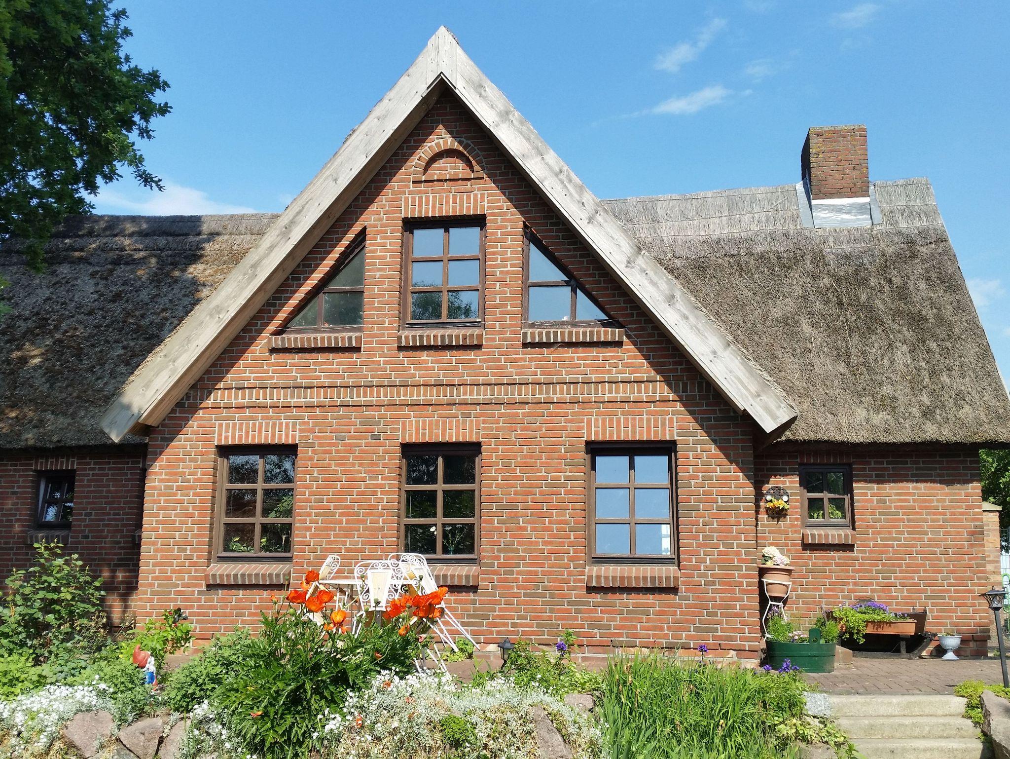 Das Ferienhaus ist im Landhausstil mit Backsteinen und Reeddach erbaut worden.