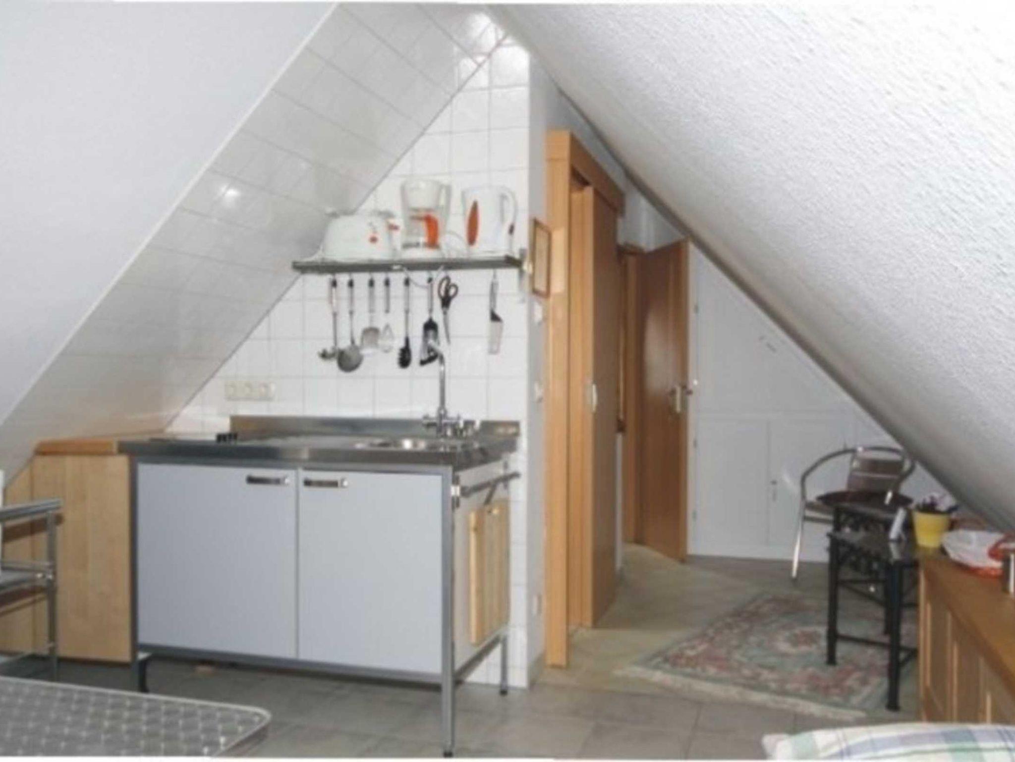 Das Appartement liegt im zweiten DG und sieht mit seinen beidseitigen Dachschrägen aus wie ein riesiges Zelt. Helle Einbaumöbel aus Birke in den Schrägen rundum prägen den gemütlichen Wohn- und Schlafbereich mit 2 Einzelbetten (nicht zusammenstellbar), eine kleine Essgruppe, ein geräumiger Einbauschrank für Kleidung sowie eine Pantryküche mit einem Ceranfeld ( 2 Platten), Kühlschrank, Mikrowelle, Kaffeemaschine, Toaster, Wasserkocher, vollständiges Geschirr und Sat-TV komplettieren die überdurchschnittliche Ausstattung. Das kleine Bad ist ausgestattet mit Waschbecken, einer Badewanne mit Brause und WC.