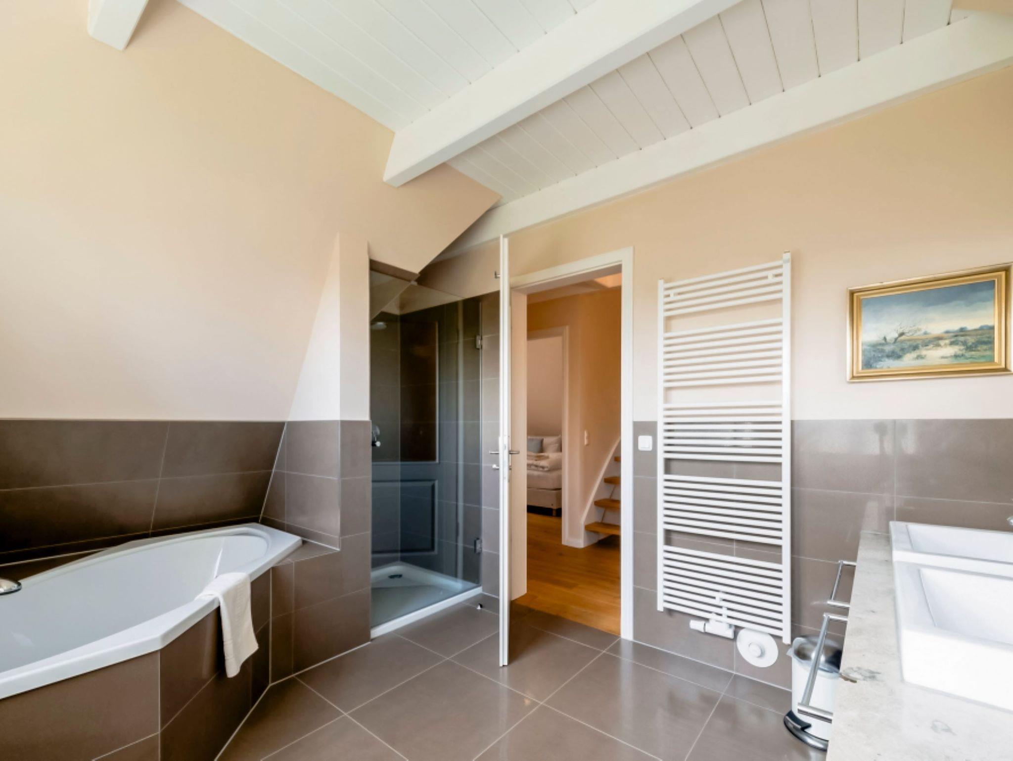 • Badezimmer: Eckbadewanne, Dusche, Waschtisch und WC.