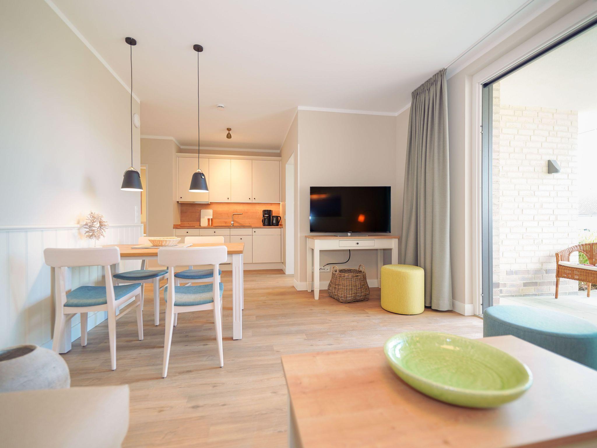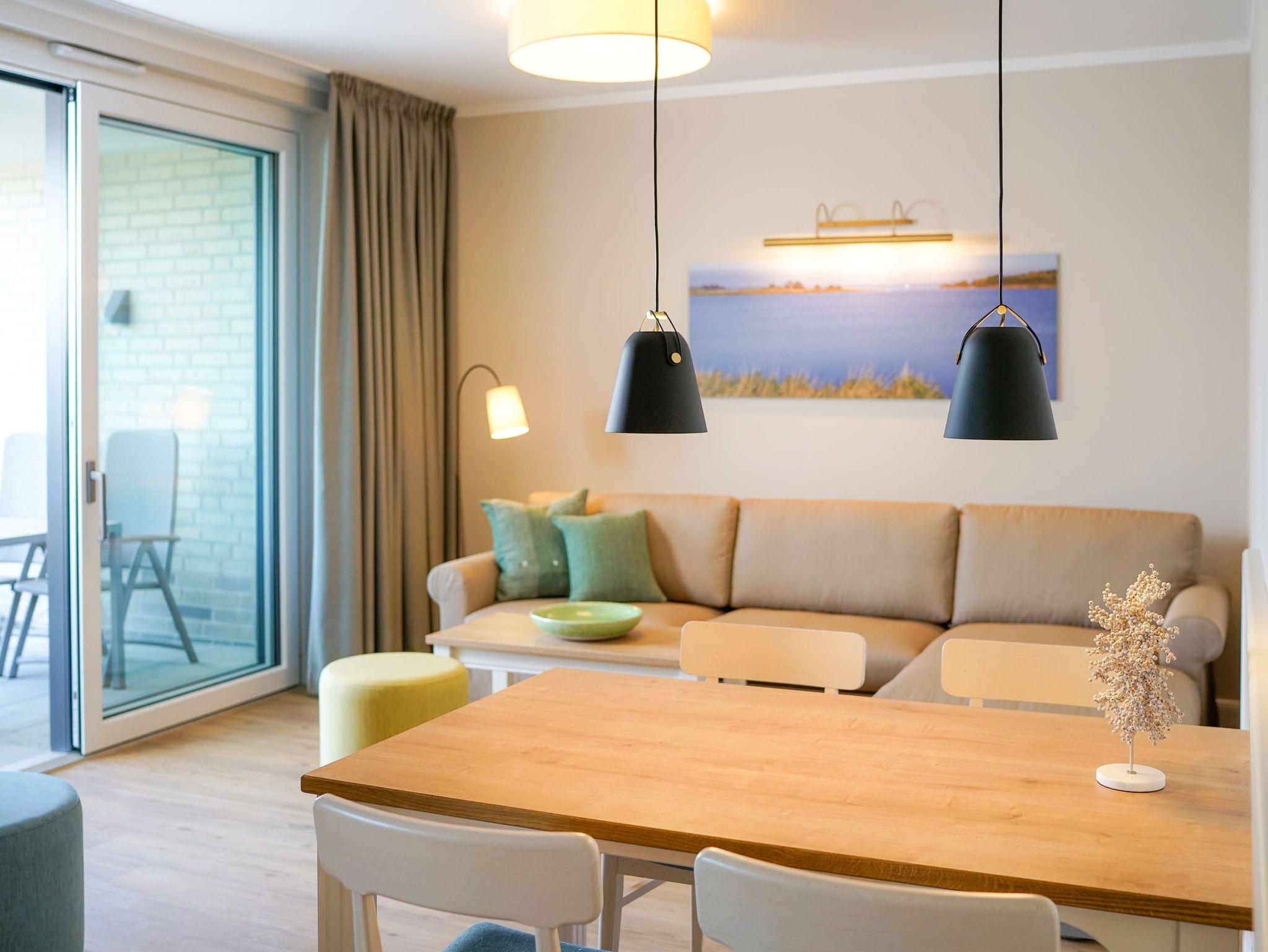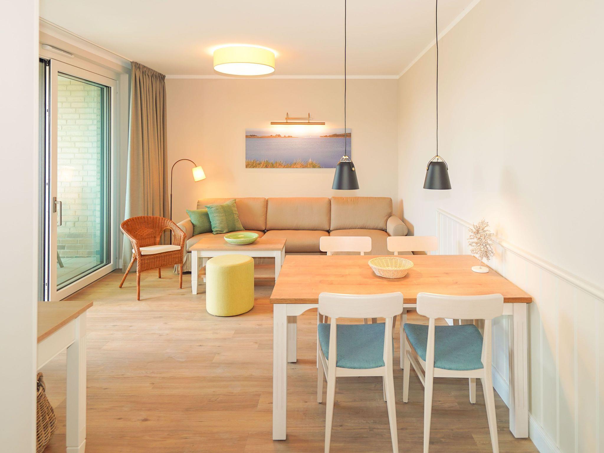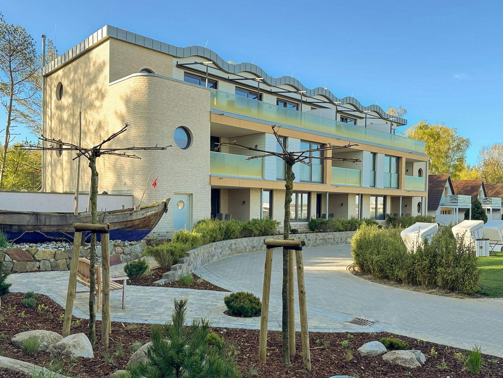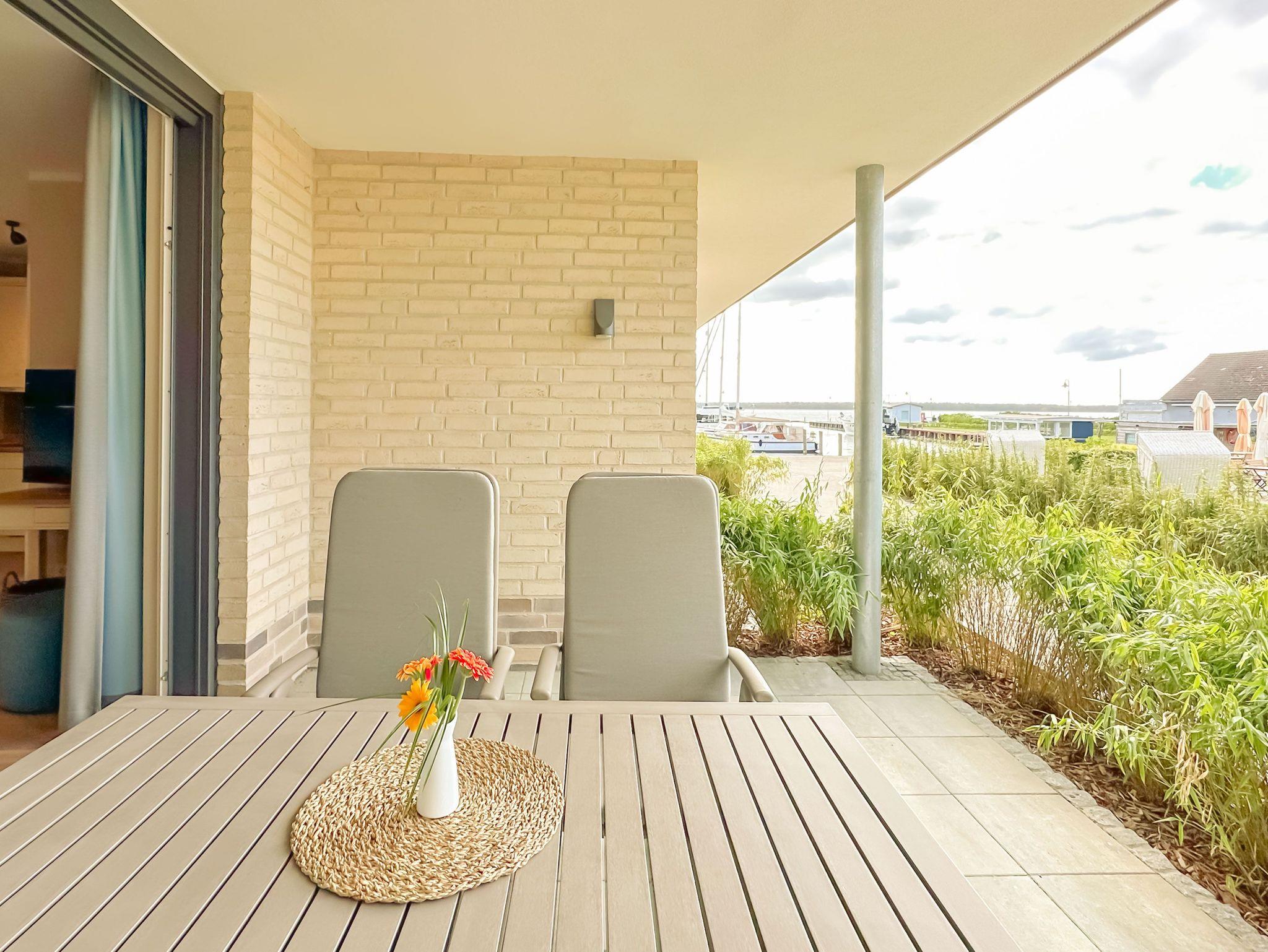 75m² Suite im EG, barrierefrei, bis zu 4 Personen. 2 Schlafzimmer mit Doppel-Boxspringbett (180x200). Voll-ausgestattete 2-Stellen Kochfeld Küche. 15 m² Veranda mit einmaligem Blick auf den Hafen. Nichtraucher-Suite. Hund möglich: 15€/Tag. Parkplatz und WLAN inkl. Dachsauna mit Terrasse, Fitnessraum und Frühstück sind vor Ort zu buchbar. Wäschepaket und Endreinigung einmalig 139,- €.