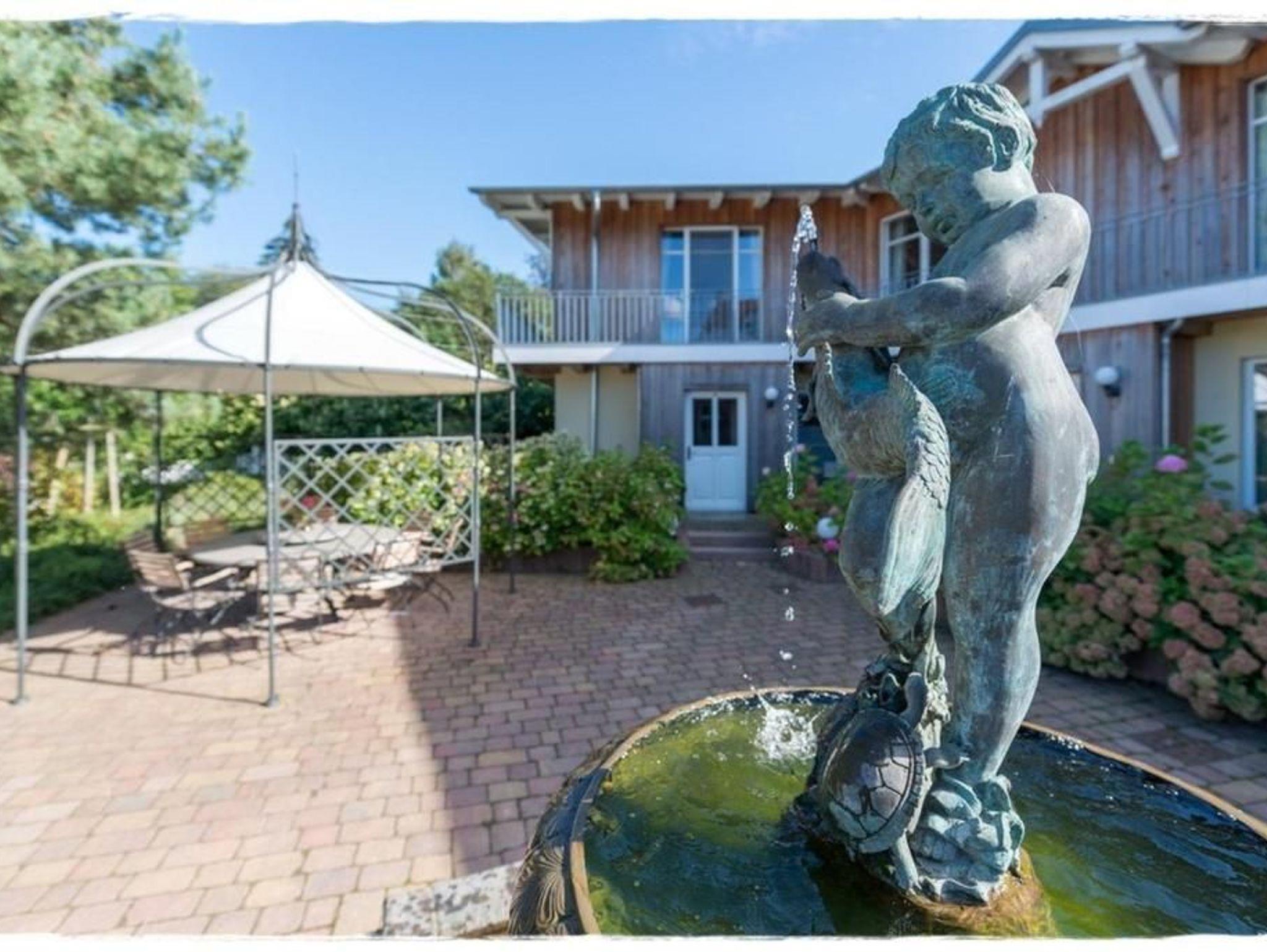 Terrasse: Die private Terrasse mit Gartenmöbeln ist direkt vom Wohnbereich zugänglich und bietet einen wunderschönen Blick auf den Brunnen im Innenhof perfekt für entspannte Stunden im Freien.