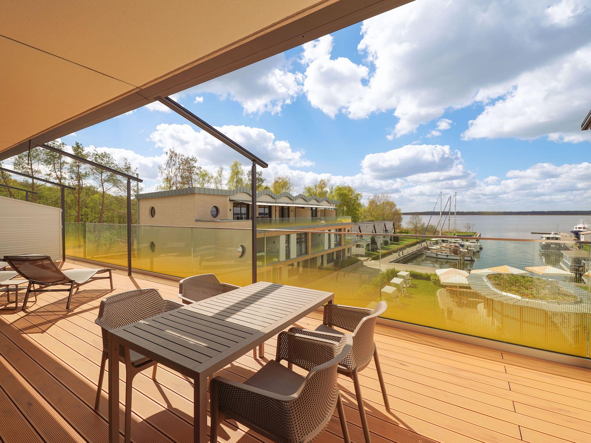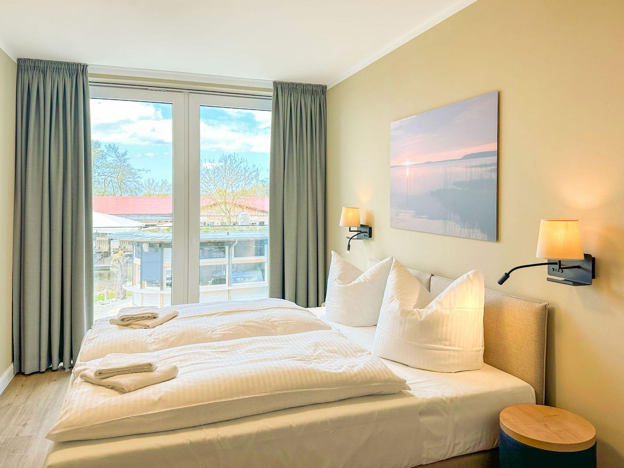 85m² Suite im OG für bis zu 4 Personen. 2 Schlafzimmer mit Doppel-Boxspringbetten (180x200).15m² Balkon mit einmaligem Blick auf Wasser und Hafen. Nichtraucher-Suite. Parkplatz undWLAN sind inklusive. Turmsauna mit Dachterrasse, Fitnessraum und Frühstück sind vor Ort zu buchbar. Wäschepaket und Endreinigung einmalig 139,- €.