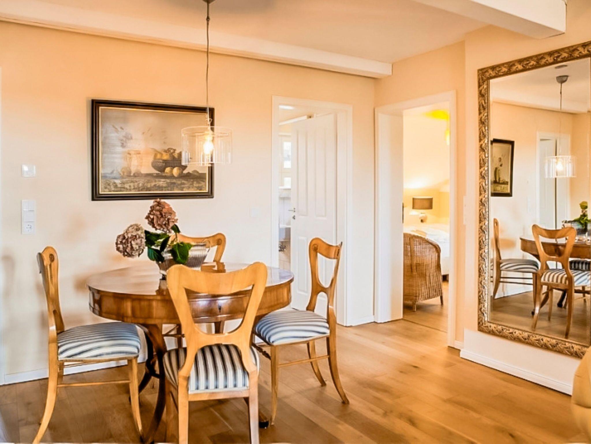 Die Einrichtung im Landhausstil, kombiniert mit hochwertigen Materialien wie Eichenböden und Fußbodenheizung, schafft ein behagliches Ambiente.