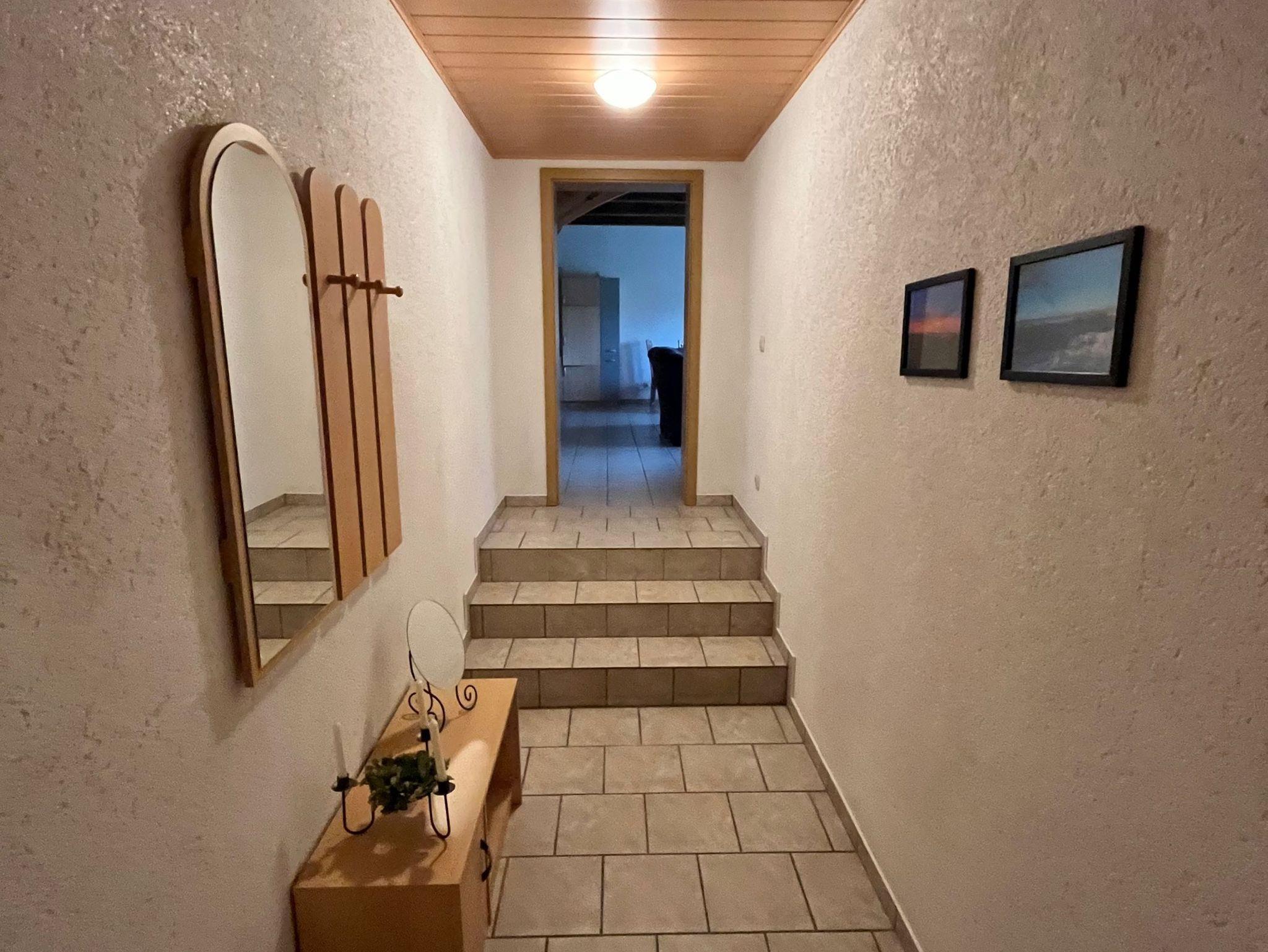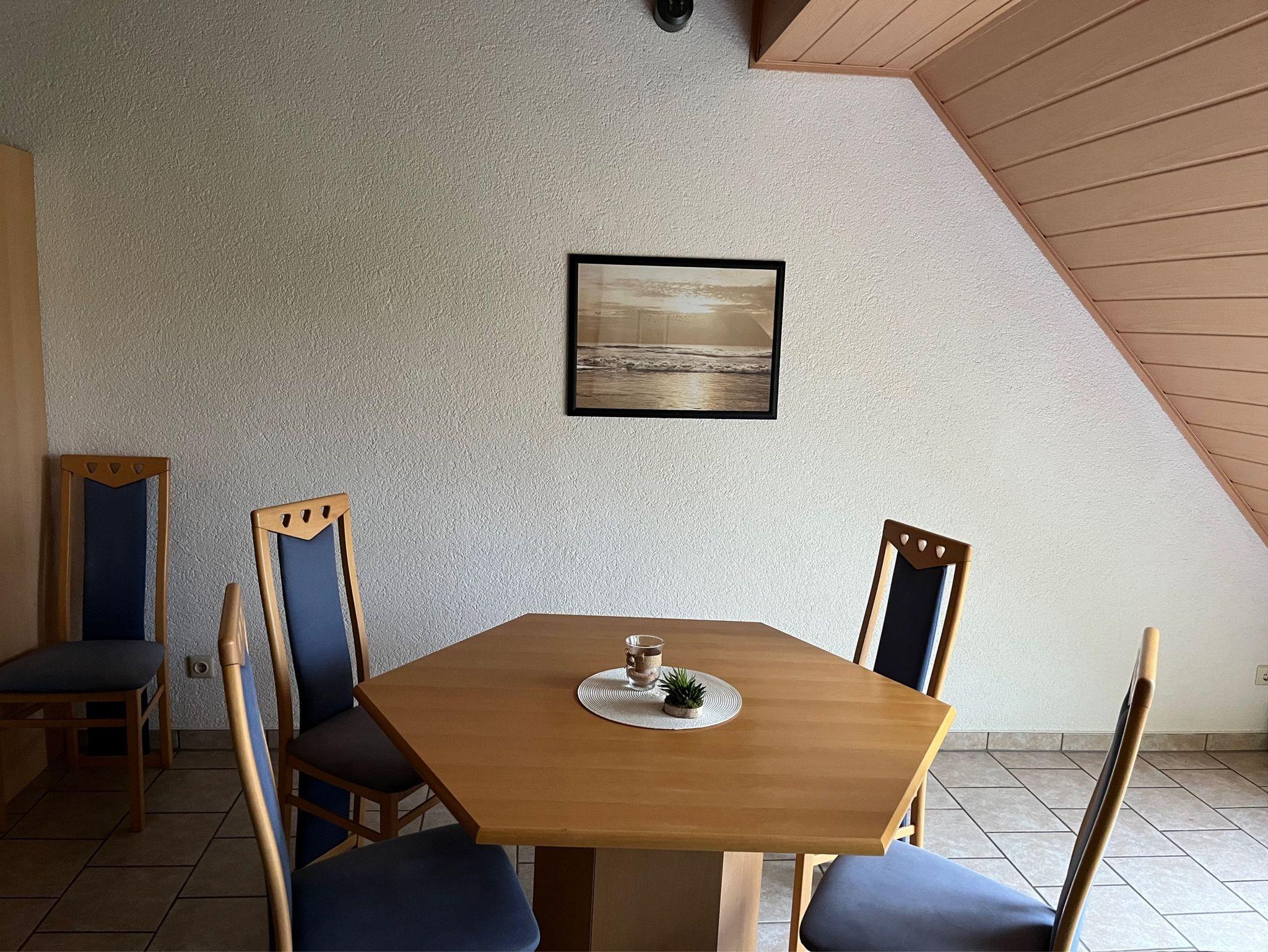 Maisonettenwohnung 70 qm groß. Wohnraum mit Schlafcouch (Leder), kleine Treppe für Empore mit Doppelbett, Küchenzeile, WC und Dusche.