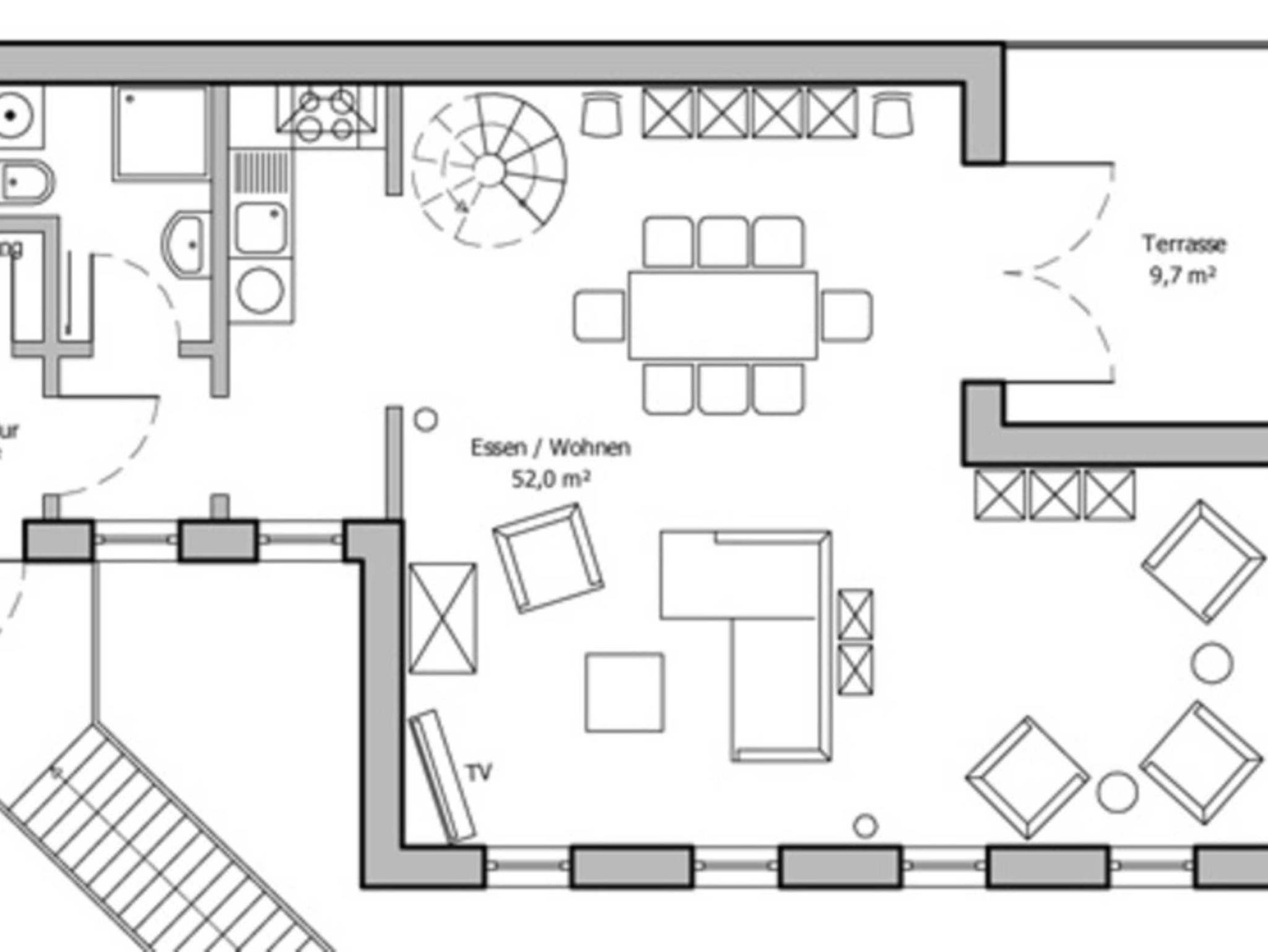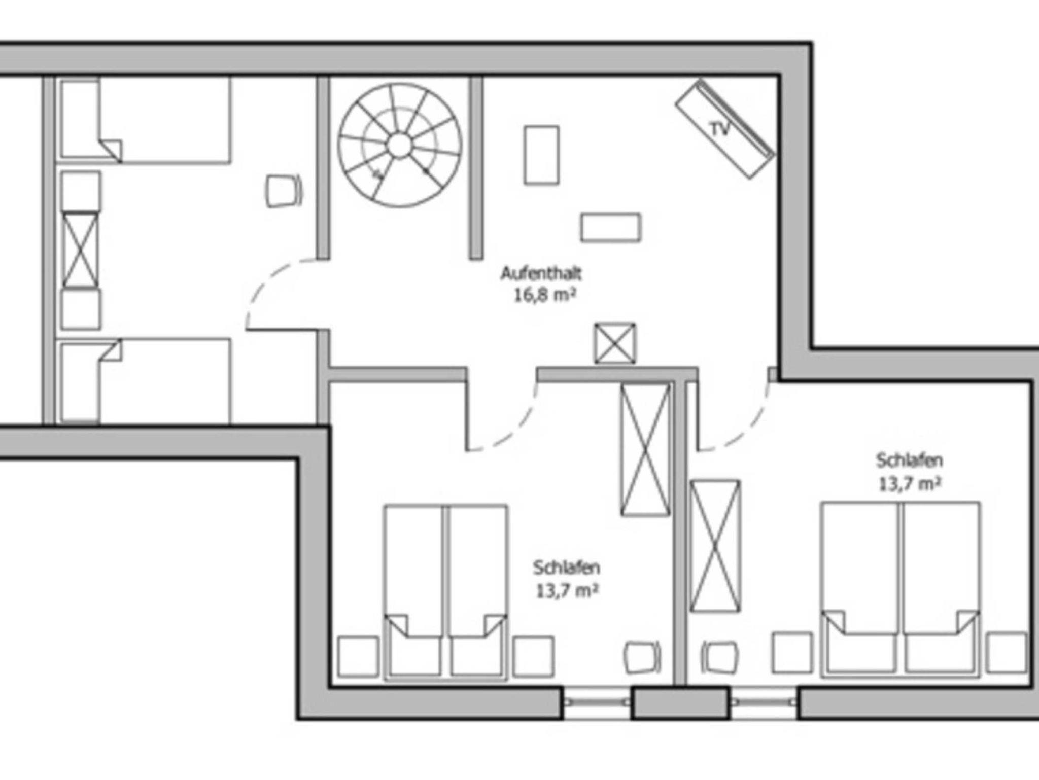 Über eine Wendeltreppe gelangen Sie in einen geräumigen Wohnflur des DG, von dem drei Schlafräume abzweigen. In dem Wohnflur befindet sich eine weitere gemütliche Sitzgelegenheit, darüber hinaus zweigt von hier ein weiterer Balkon mit Relaxliege ab. Alle Räume im DG haben Dachschrägen. Zwei Schlafzimmer sind mit Ehebetten (1,80x2,00) und eins mit Einzelbetten ausgestattet.