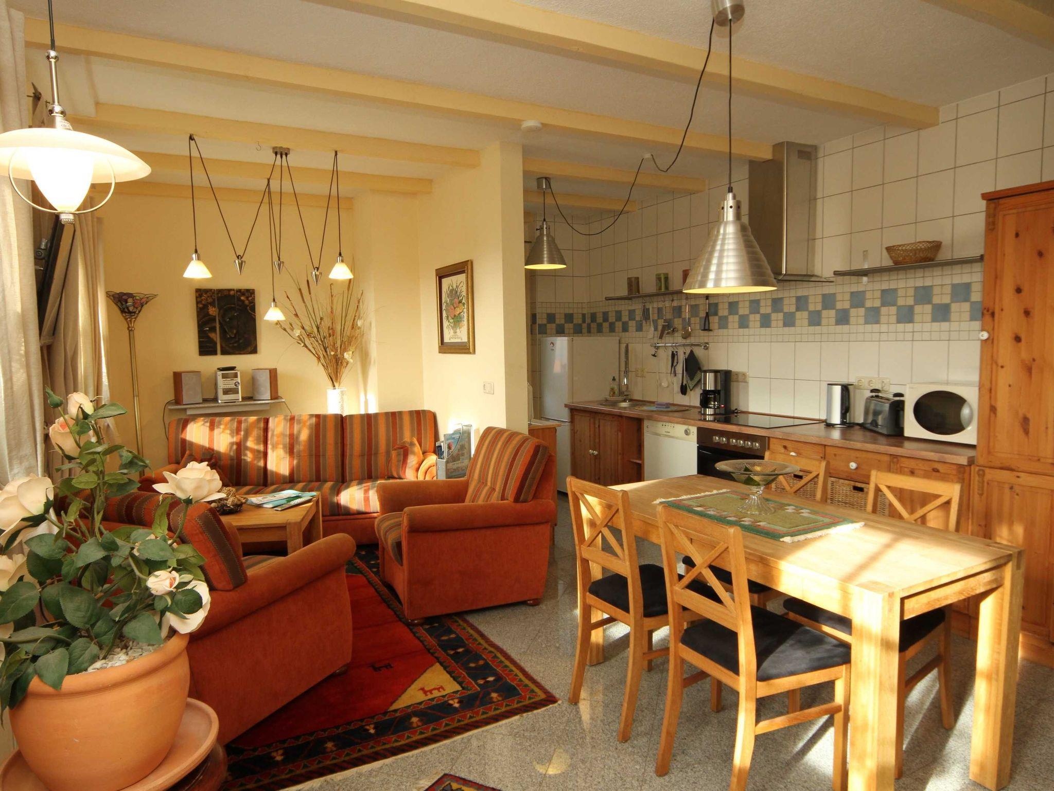 Von diesem gelangen Sie ins Bad und in den Küchen-, Ess- und Wohnbereich. Das Bad ist ausgestattet mit Dusche, WC, Haarfön. Vom Essbereich gelangen Sie in den gemütlichen Wohnbereich mit Couchgarnitur und Sat-TV,Stereoanlage sowie in den vollständigen Küchenbereich mit Ceranfeld, Backofen, Geschirrspüler, Kühl-/Gefrierkombination, Mikrowelle, Kaffeemaschine, Toaster, Wasserkocher und Geschirr.