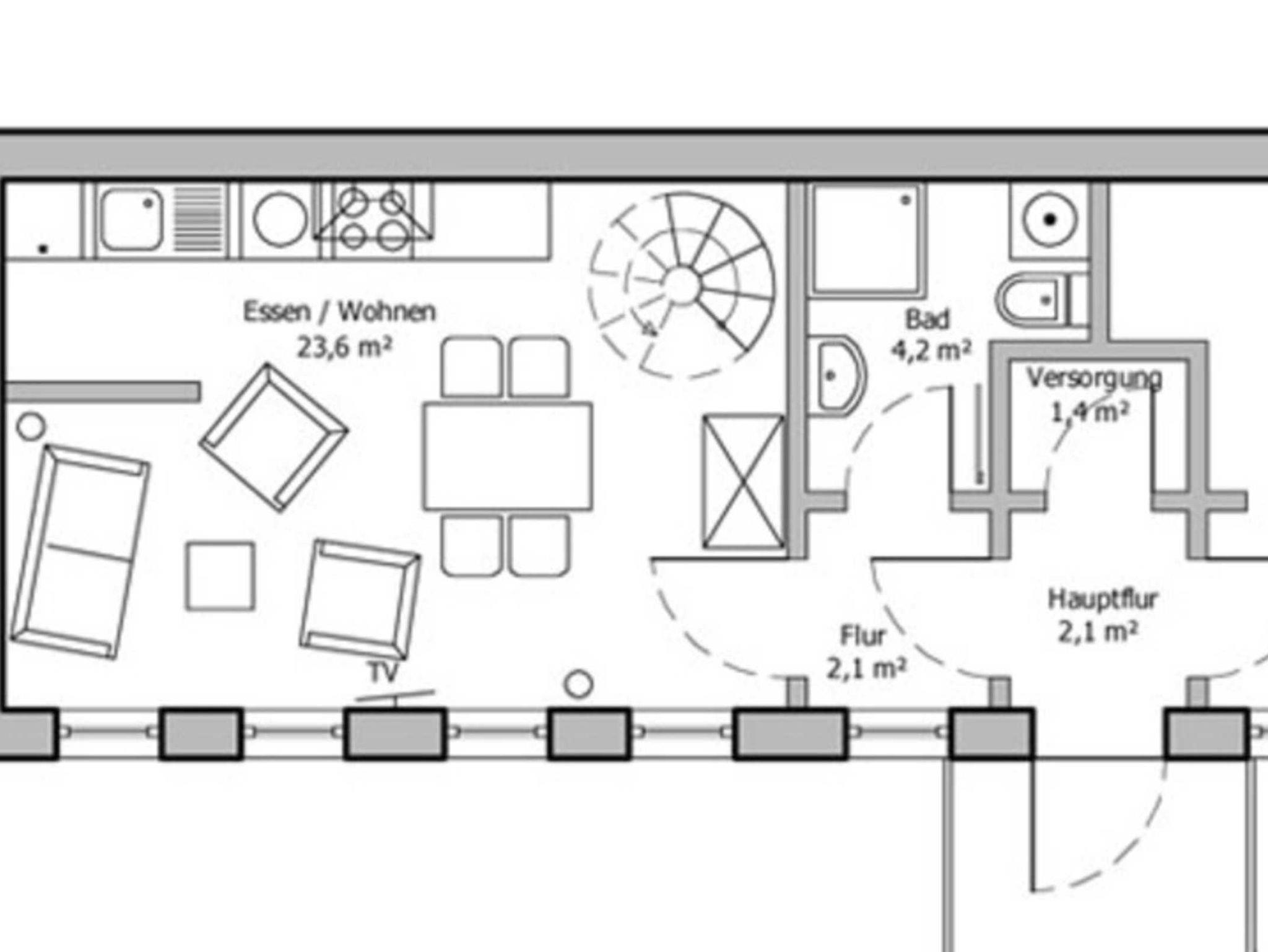 Über eine Wendeltreppe gelangen Sie in einen kleinen Vorflur des DG von dem zwei Schlafräume abzweigen. Alle Räume im DG haben Dachschrägen. Ein Schlafzimmer ist mit Ehebett und eins mit Einzelbetten ausgestattet.