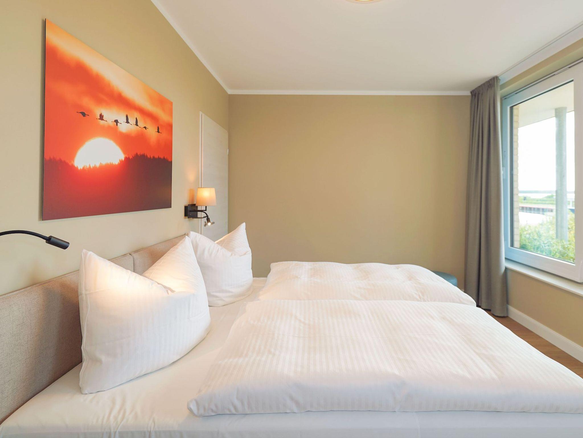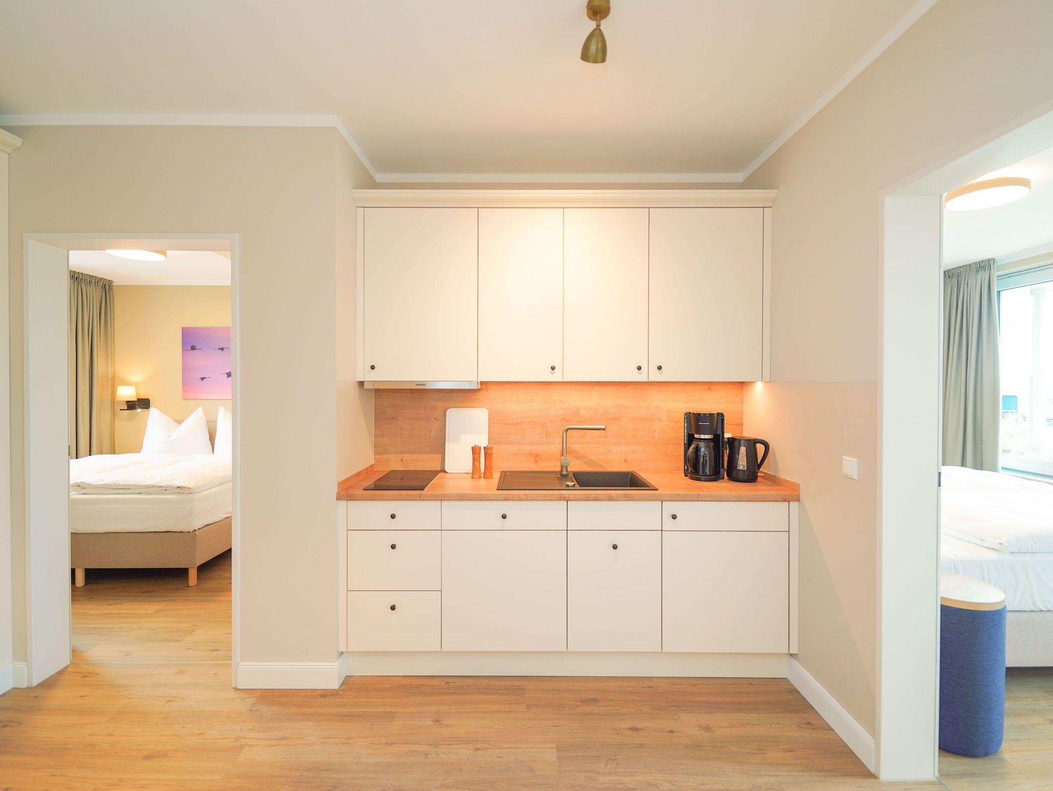 75m² Suite im EG, barrierefrei, bis zu 4 Personen. 2 Schlafzimmer mit Doppel-Boxspringbett (180x200). Voll-ausgestattete 2-Stellen Kochfeld Küche. 15 m² Veranda mit einmaligem Blick auf den Hafen. Nichtraucher-Suite. Hund möglich: 15€/Tag. Parkplatzund WLAN sind inklusive. Dachsauna mit Terrasse, Fitnessraum und Frühstück sind vor Ort zu buchbar. Wäschepaket und Endreinigung einmalig 139,- €.