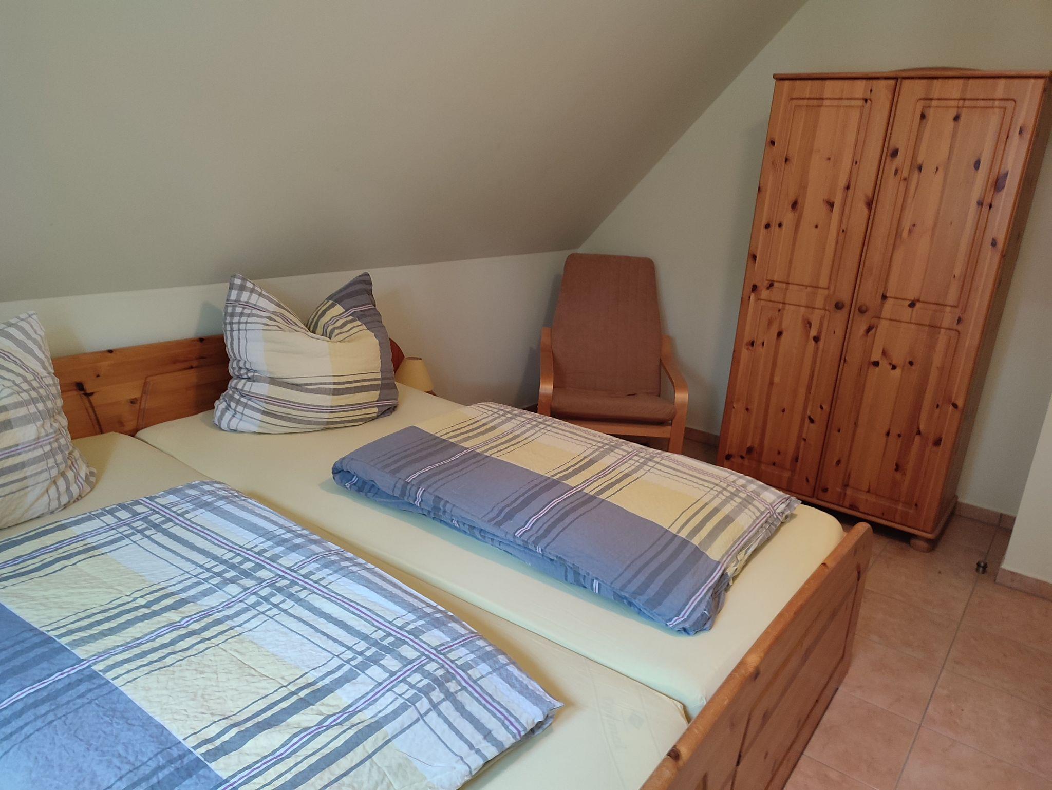 Diese 3 Raum Ferienwohnung im 1.OG verteilt sich auf 2 Etagen. Wohnzimmer mit integrierter Küchenzeile und TV. Schlafzimmer mit Doppelbett, ein Schlafzimmer mit 2 Einzelliegen ist über eine Treppe im ausgebauten Dachgeschoß zu erreichen. Eine Sitzgelegenheit im Garten mit Grillmöglichkeit ist vorhanden. PKW Stellplatz auf dem Grundstück. Handtücher bitte selbst mitbringen. Alle Nebenkosten sind im Preis inklusive!