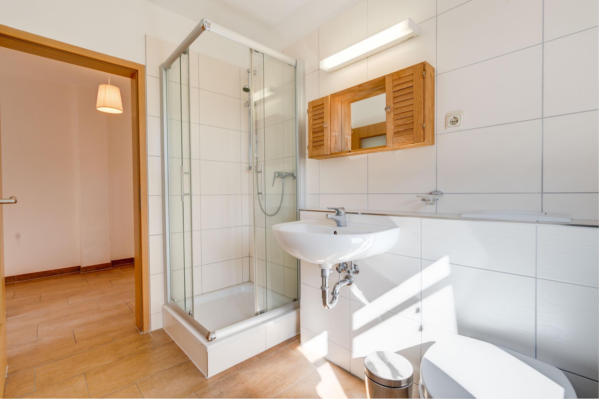 Das 3 Raum Apartment mit 83 m² ist für bis zu 6 Personen geeignet. Im Erdgeschoss befinden sich der Wohnraum mit 2 Aufbettungsmöglichkeiten, eine geschlossene Küche und das Gäste-WC. Eine Holztreppe im Eingangsbereich führt in das 1. Obergeschoss mit 2 Schlafzimmern und einem Badezimmer (DU/WC).