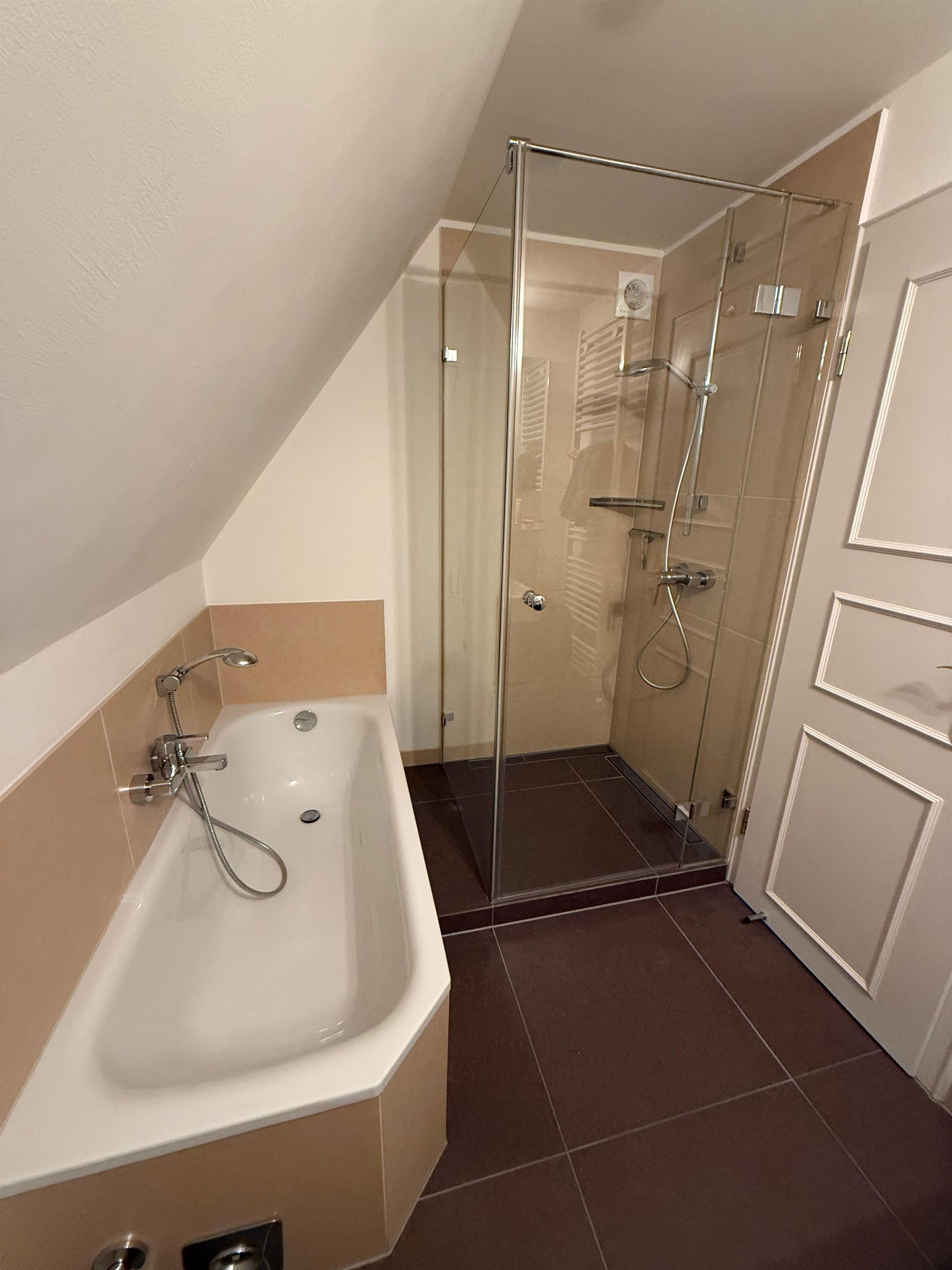Das Bad ist modern mit Dusche und Badewanne ausgestattet.