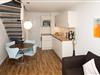 im 1. Obergeschoss eines Reetdachhauses. Über zwei Ebenen befindet sich die Wohn/Küche im unteren Bereich; der Schlafbereich ist über eine Treppe zum Dachgeschoss erreichbar. Eine kleine Leseecke lädt zum Entspannen ein. Die Küche ist komplett ausgestattet mit Nespresso-Maschine, Wasserkocher, Toaster, Mikrowelle/Ofen.