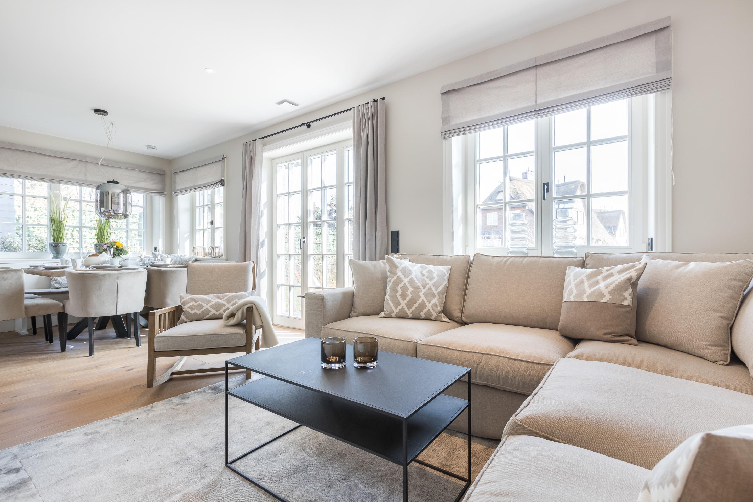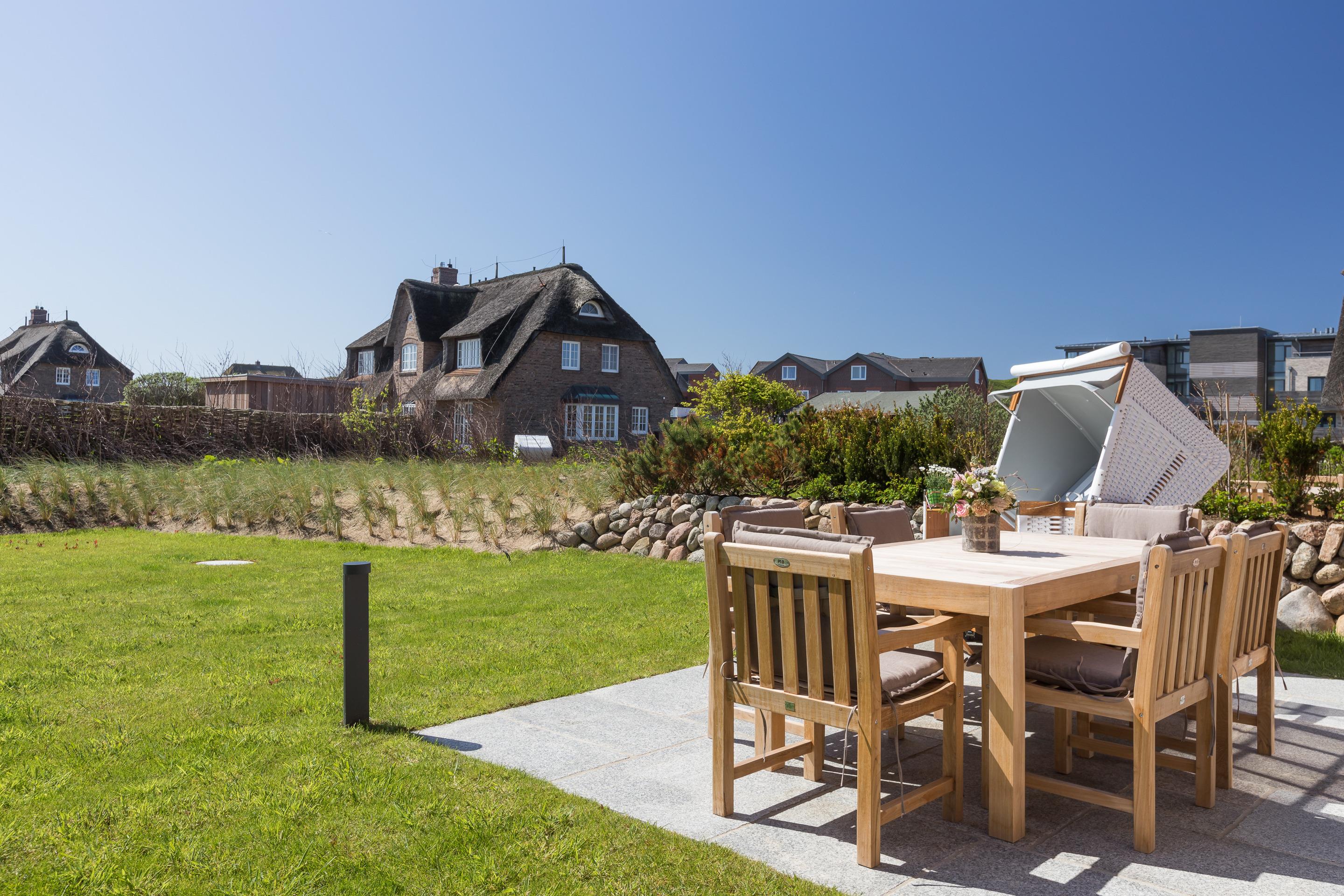 Beginnend im Entre finden Sie linkerhand ein kleines Gäste-WC. Dem Flur folgend gelangen Sie in einen warmen, ganztägig lichtdurchfluteten Wohn- und Essbereich. Die Küche lässt mit modernen Miele-Geräten, einem Weinkühlschrank und einer Nespresso-Kaffeemaschine keine Wünsche offen. In den kalten Monaten wärmt Sie ein Gaskamin, während sie den kalten Herbsttürmen lauschen oder einen Film auf dem großen Flat-TV genießen. Vom Wohnbereich aus gelangen Sie zum top gepflegten Südgarten mit komfortablen Gartenmöbeln und Sylt-typischen Strandkorb.